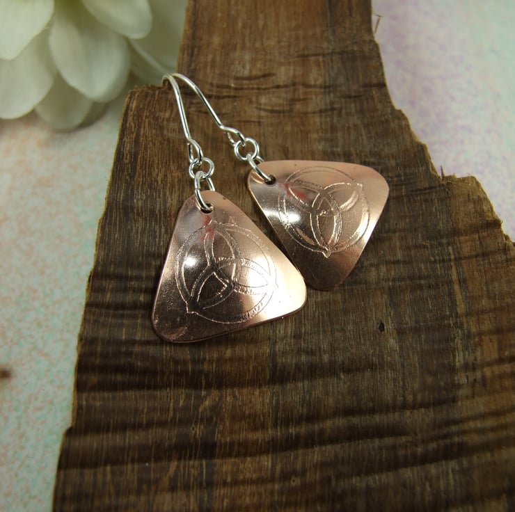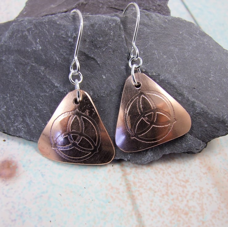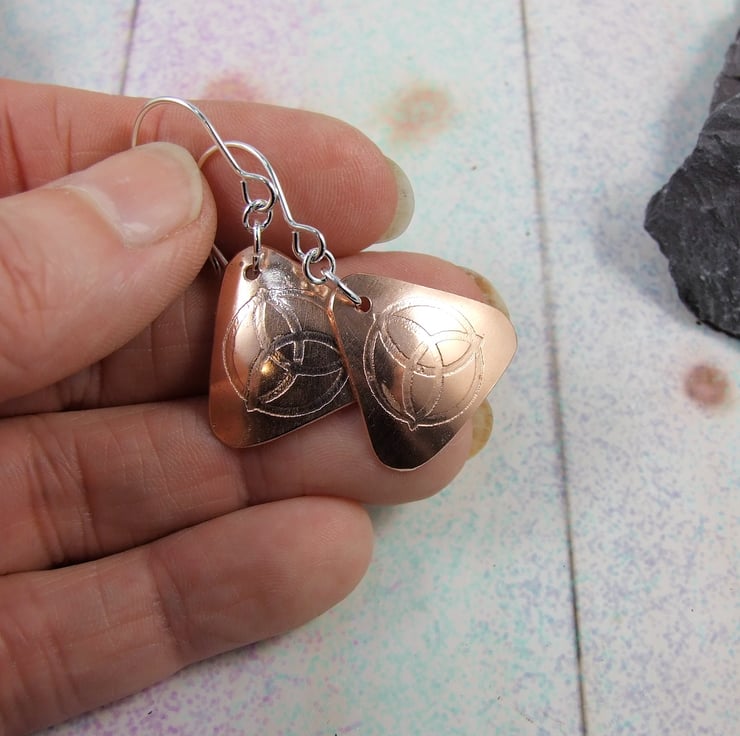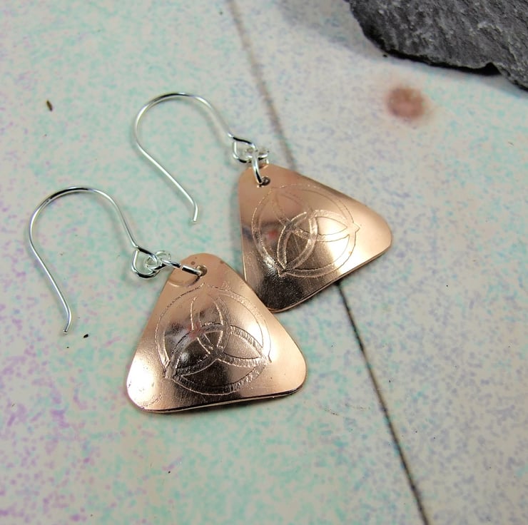 Triquetra Earrings, hand forged Copper Triangles etched with my own hand drawn Trinity Knot