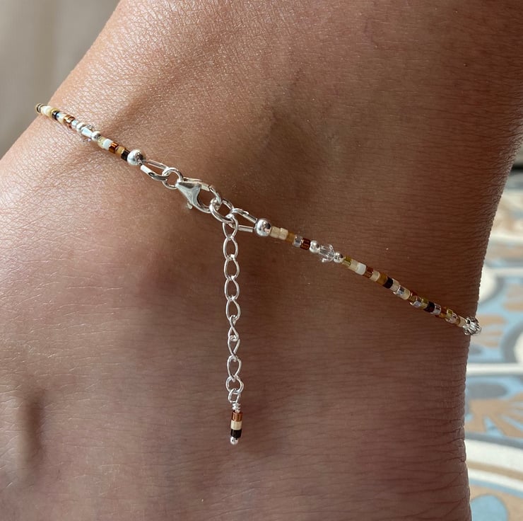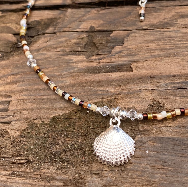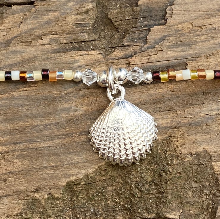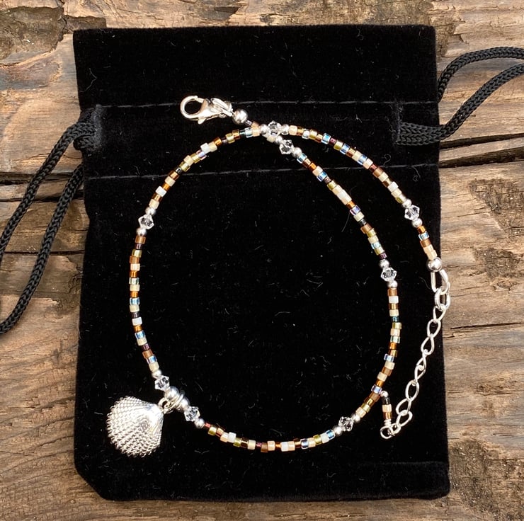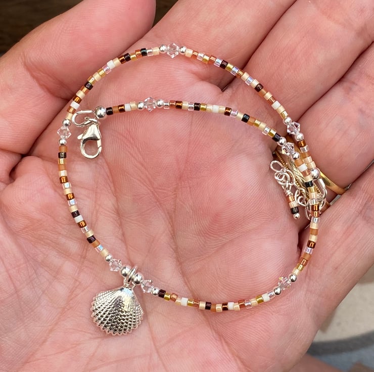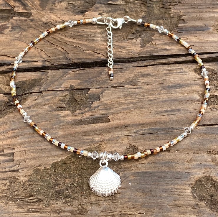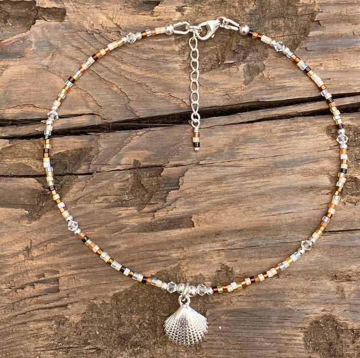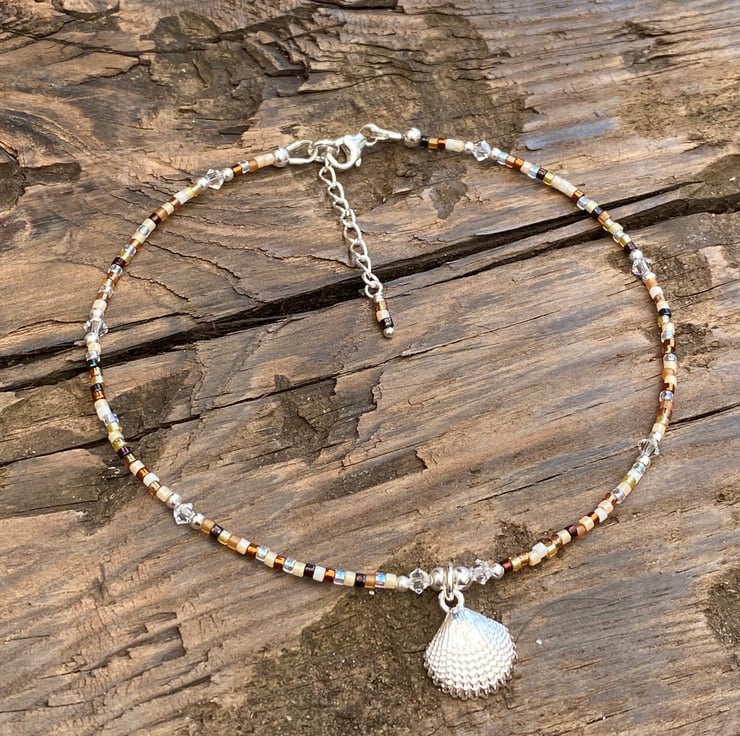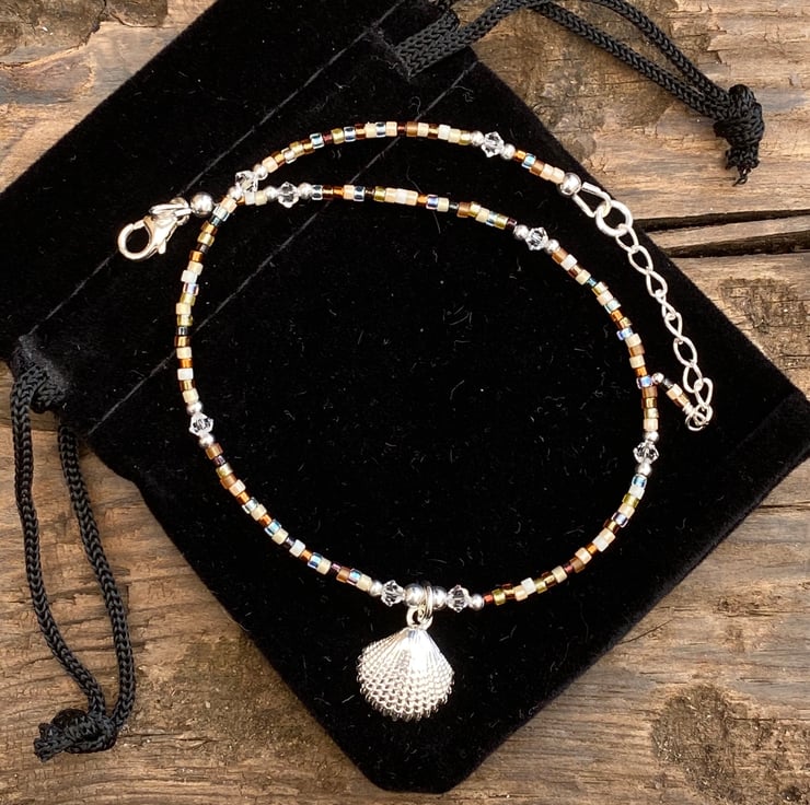 This cute beach themed anklet has been made using a sweet 14x12 mm sterling silver shell pendant, centralised between 3mm sterling silver beads and 3mm Swarovski crystals. Hand beaded with Miyuki bead mix and equally positioned 2mm sterling silver beads and 3mm Swarovski crystals.
