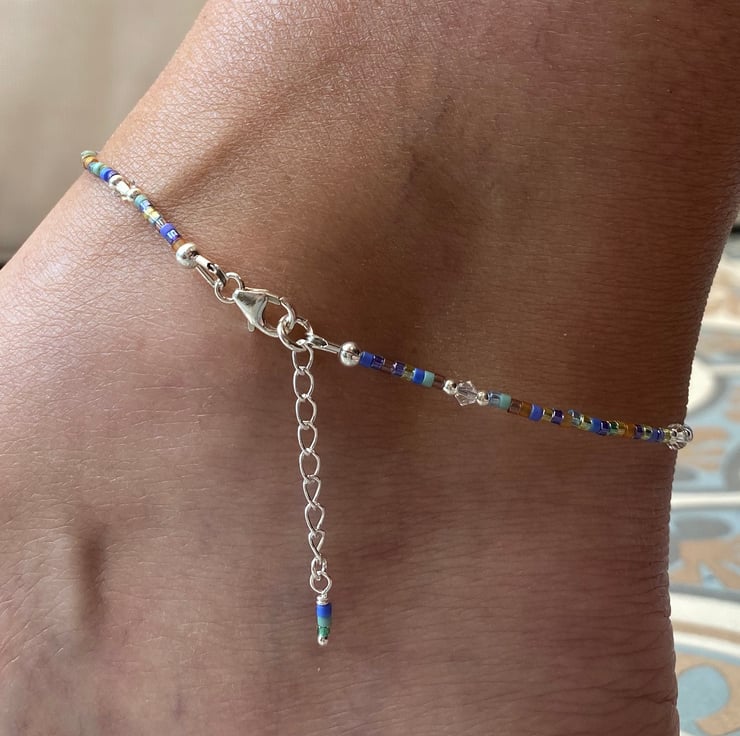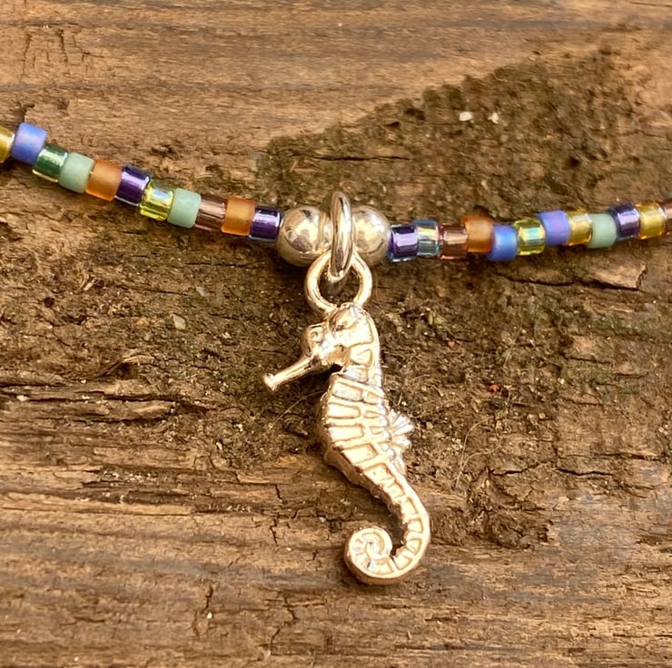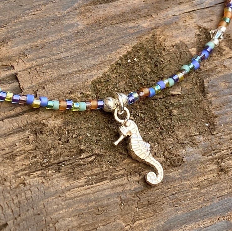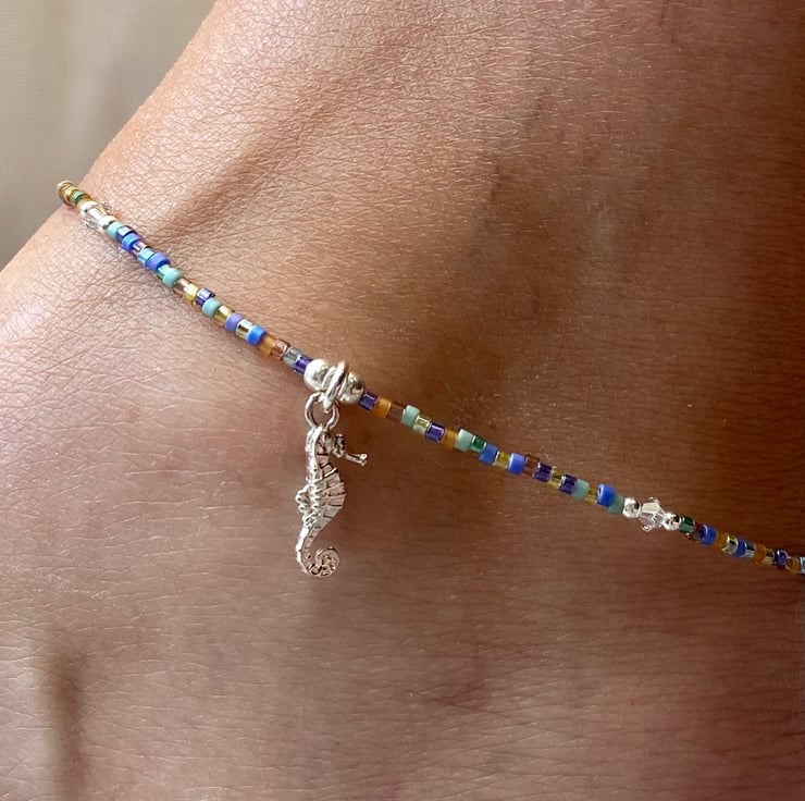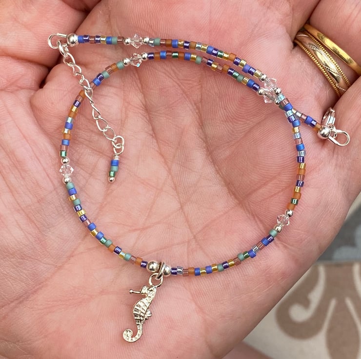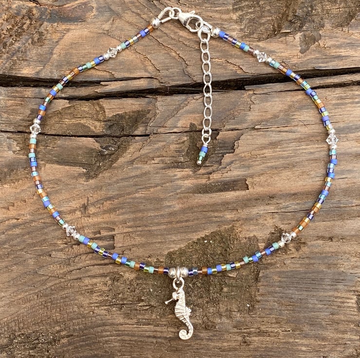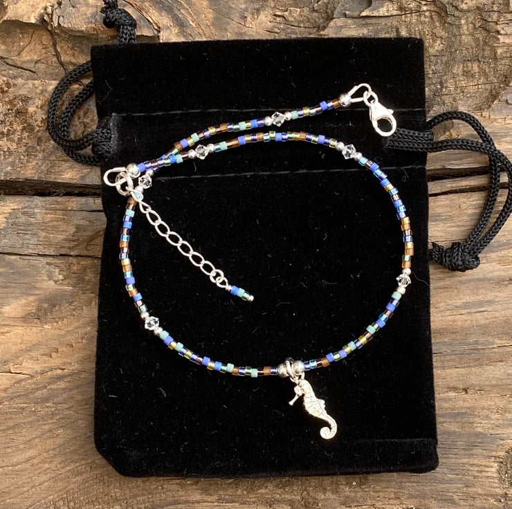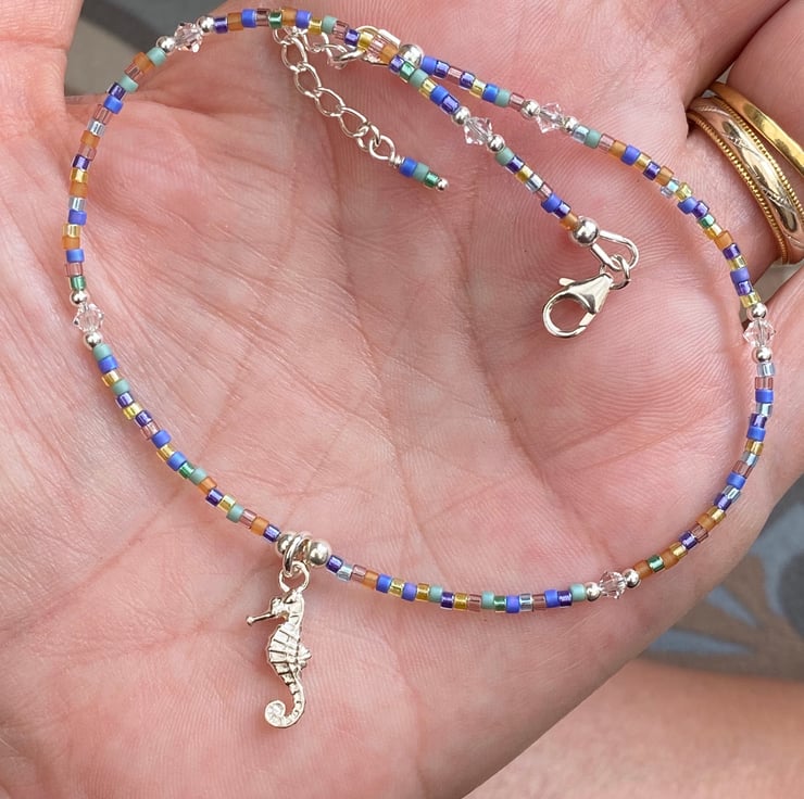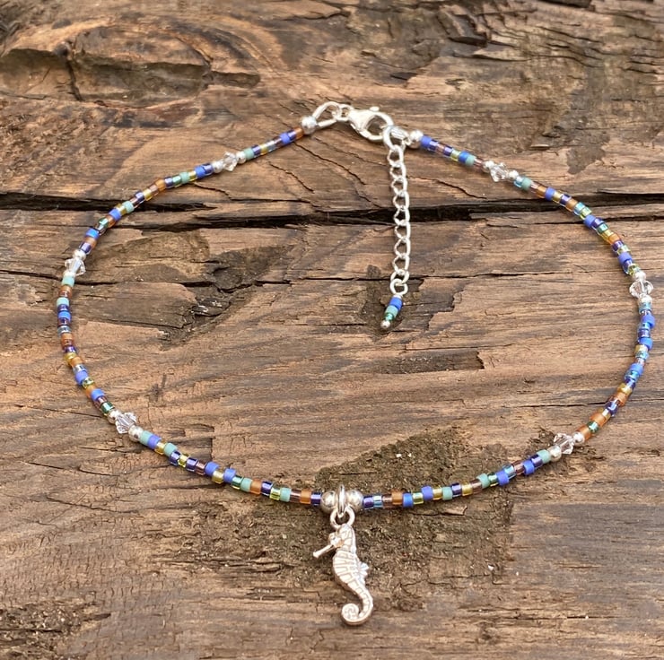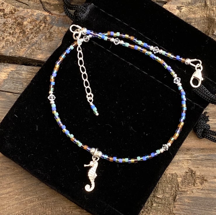 This cute beach themed anklet has been made using the cutest detailed sterling silver seahorse charm, centralised between 3mm sterling silver bead. Hand beaded with Miyuki bead mix and equally positioned 2mm sterling silver beads and 3mm Swarovski crystals.