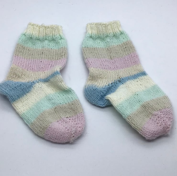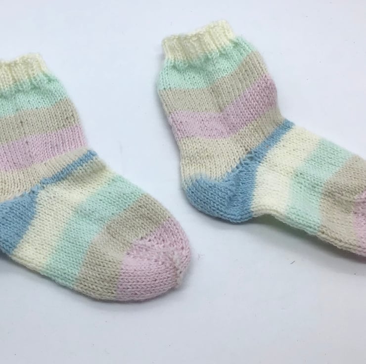 A pair of gorgeous hand knit socks in a lovely soft merino wool/ nylon mix. They are the colours of Neapolitan ice cream - pink, cream, blue, green, coffee. They measure approximately 6” from heel to toe which is a uk child’s size 7 to 8 shoe. They have some give in them.