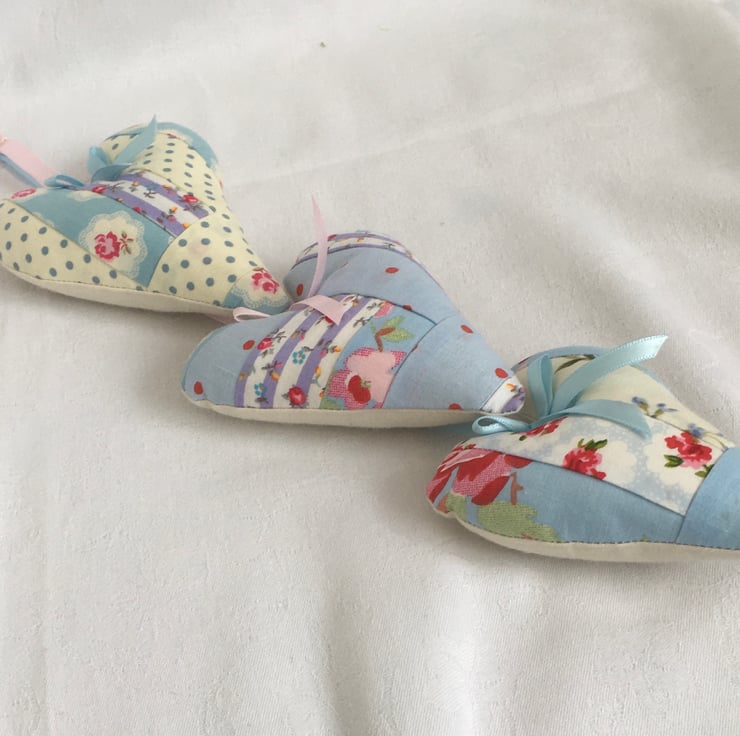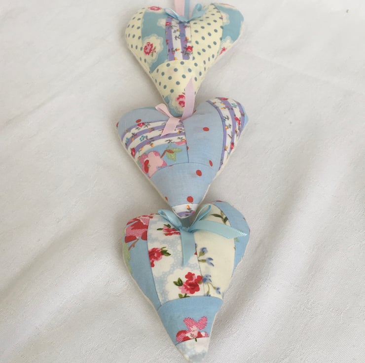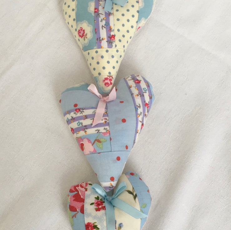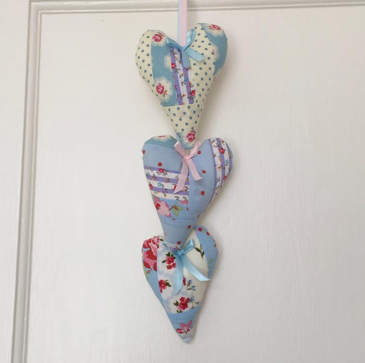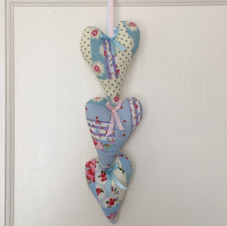 This beautiful set of 3 hanging hearts, has been made using scraps of fabric for the fronts on the hearts, each one an individual, although they all hang from one hoop, staggered, with satin ribbon. A unique set ready to be hung against a wall or door on display, or even in the wardrobe among your clothes. This as the backs of each heart is plain calico, to which drops of your favorite scent can be put, so as not to discolour the pretty fronts.