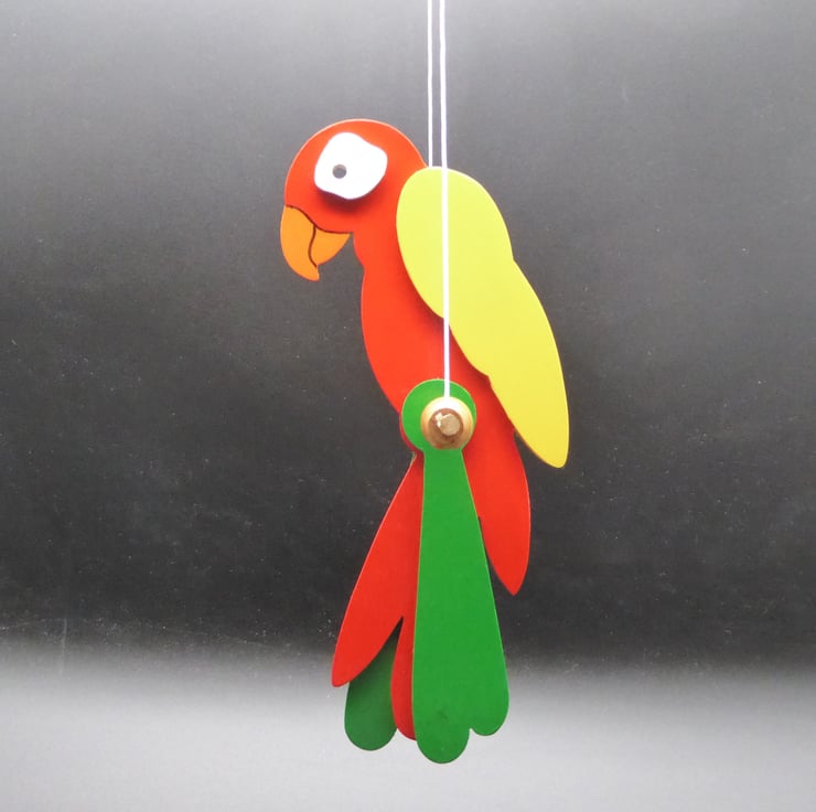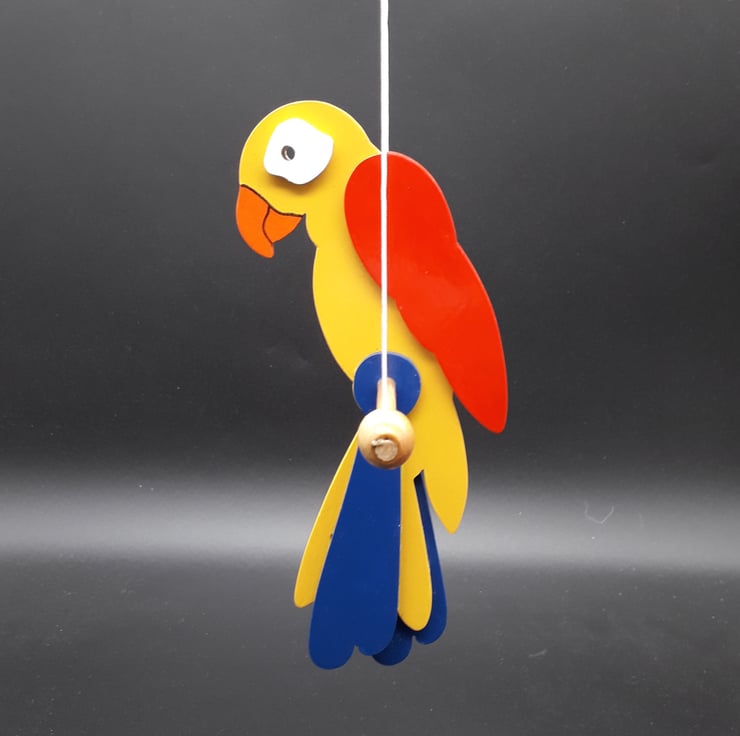 A cheerful addition to any Nursery, Playroom or indeed any other room, this brightly coloured Parrot, hand crafted from layered Birch plywood, is designed to be hung over Baby's crib, cot, or anywhere else within sight of your baby or toddler. It can be "wound up" on its hanging cord, and when released will roll over and over, similarly to a yo-yo, with a motion and flash of colour guaranteed to attract the attention of babies and toddlers alike. Height approx 20cm, hanging cords 65cm long. Finished with child-safe gloss enamel and varnish. Colour combination may vary from that shown, but all will feature Blue/Red/Yellow or Green/Red/Yellow - please state your preference when ordering.