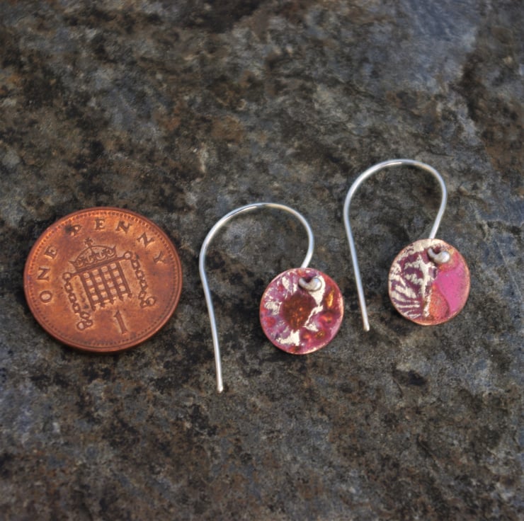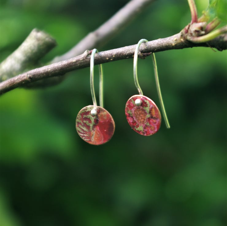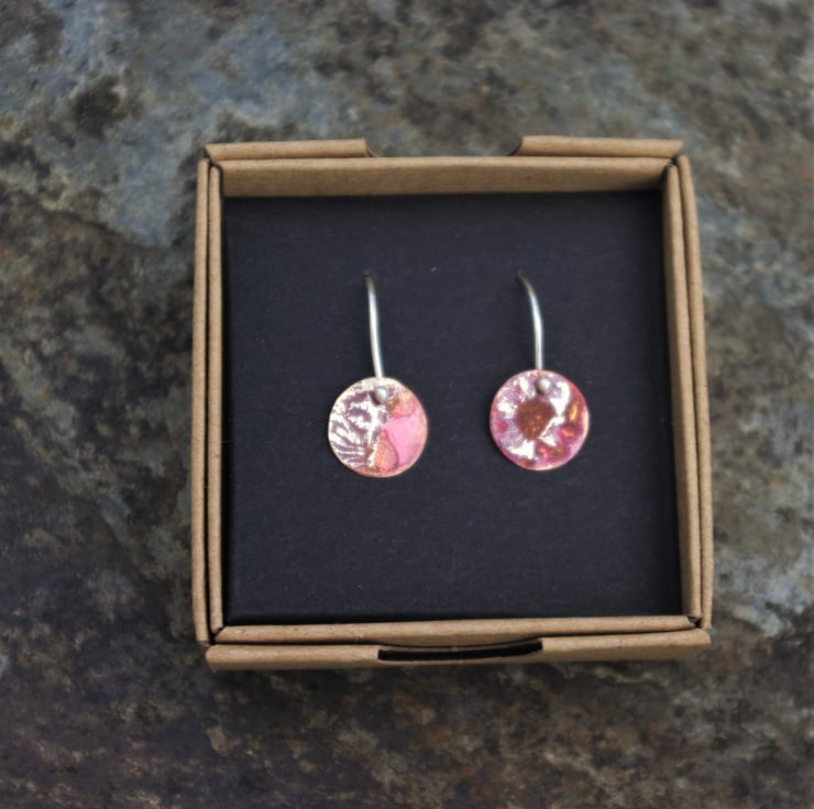Small copper discs with texture, inspired by the moon and designed to hang just off the earlobe. The texture is produced using heat and recycled silver dust on the surface of the copper. The earrings aren't absolutely identical as the process gives unpredictable (but always exciting) results. Through the heat process , the copper has gained dark tones and red/orange colours which are brighter in the light . The colours are protected with a penetrating wax
