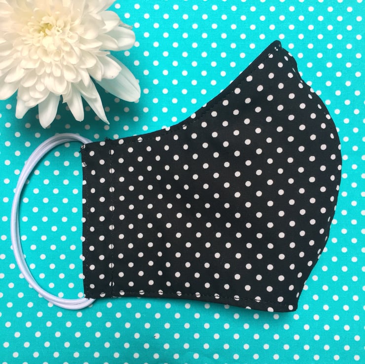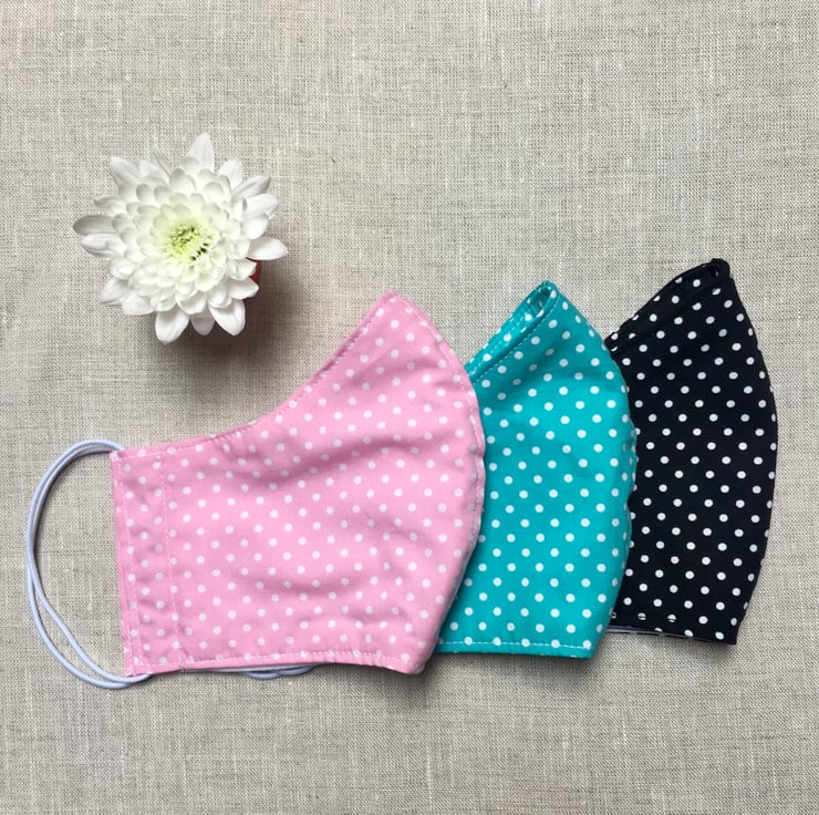 These quality cotton dotted fabric masks are available in a range of colours and patterned with small white dots. The mask is lined with a high threads count cotton which is extremely soft on the skin.