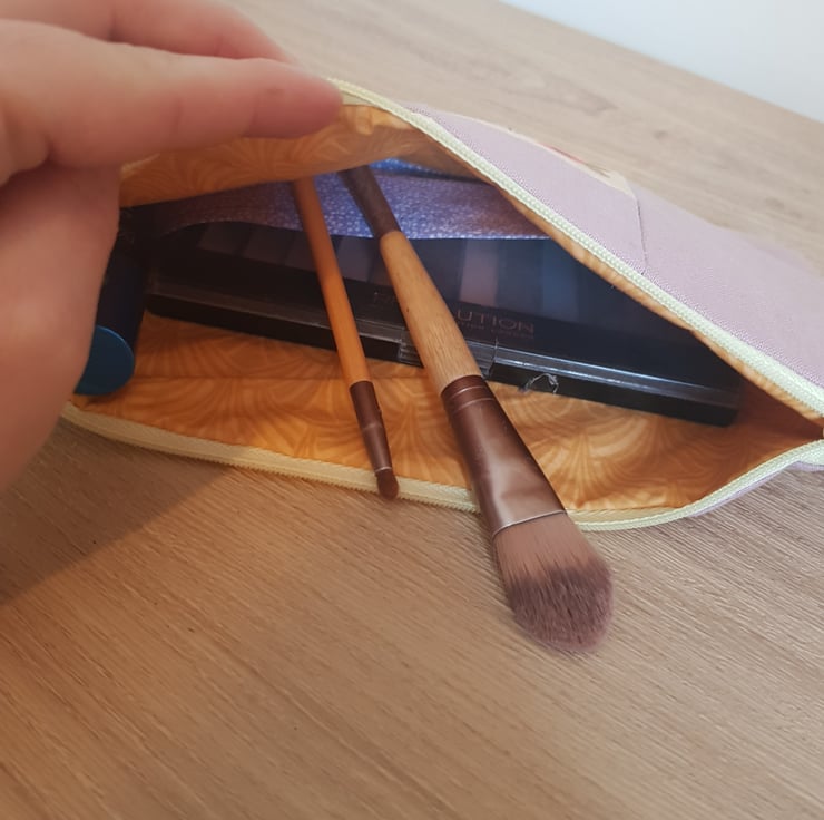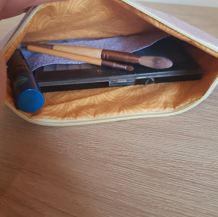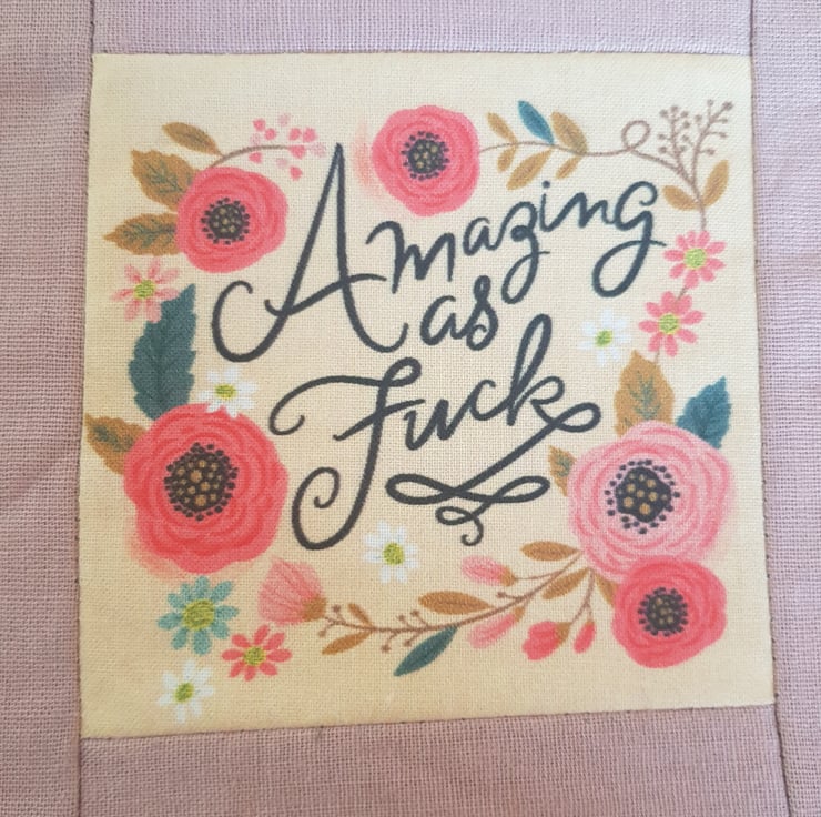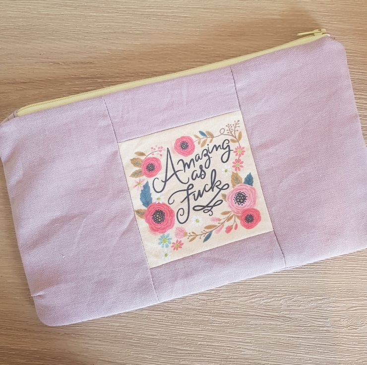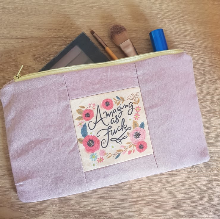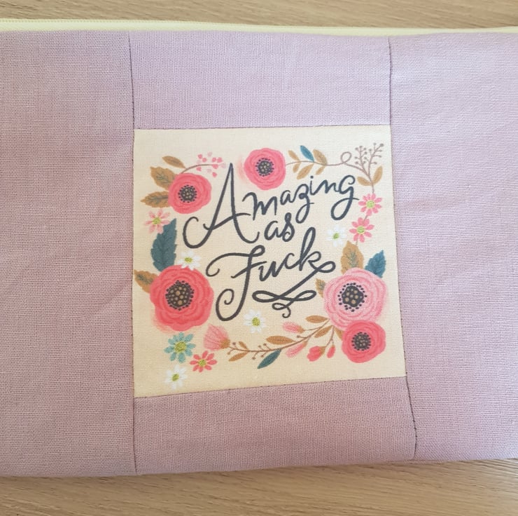 This is a hand made one of a kind make up bag or pencil case users choice , in a beautiful dusky pink linen it has a yellow art deco lining and blue floral divider . The real feature of this range is the panel on the centre front of the bag this one reads ''Amazing as fuck'' surrounded by poppy's and wild flowers . This hole collection is a little bit cheeky but all beautifully don there are no repeats in this collection so every bag is a one off they are all also roughly 10 by 6 inches with a 9 inch zip .