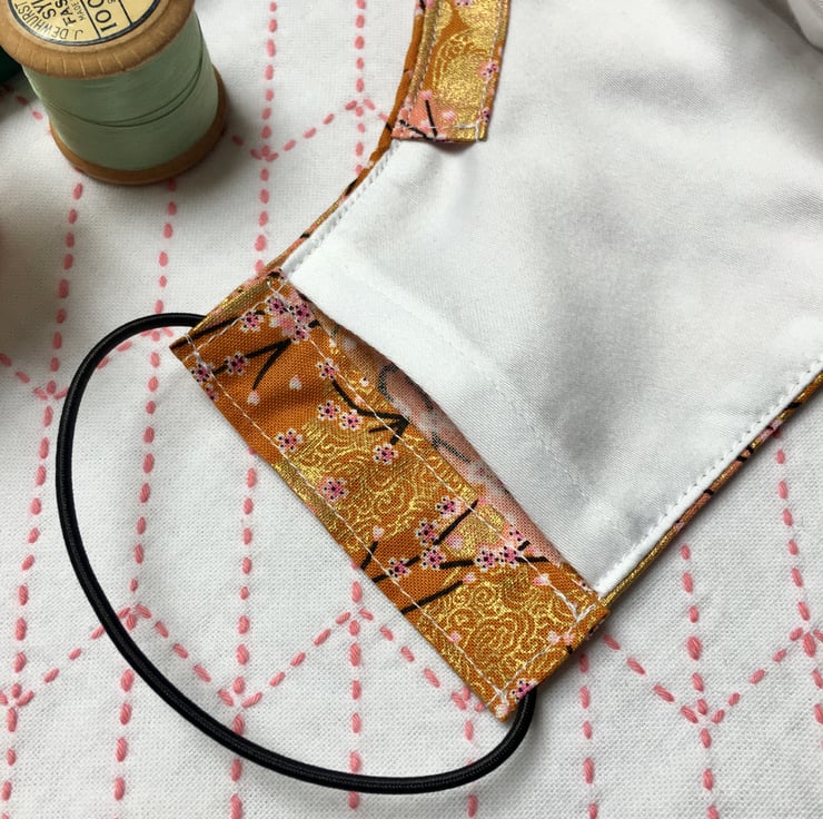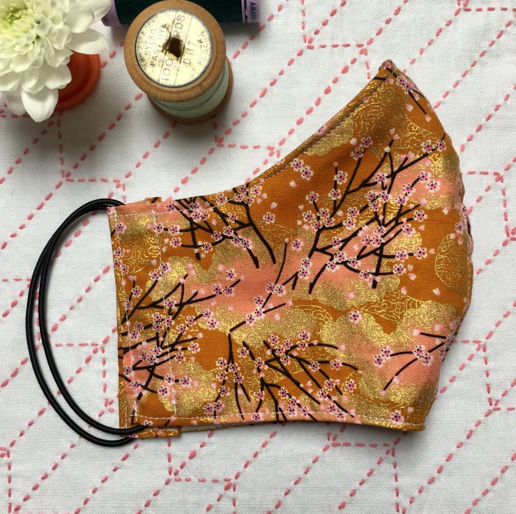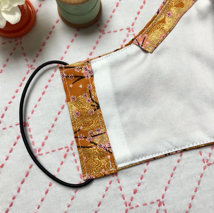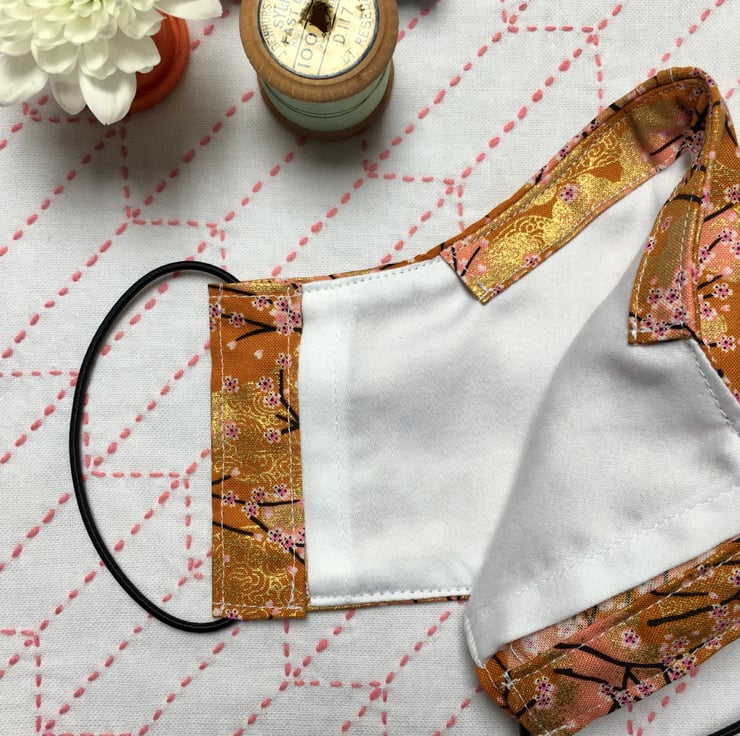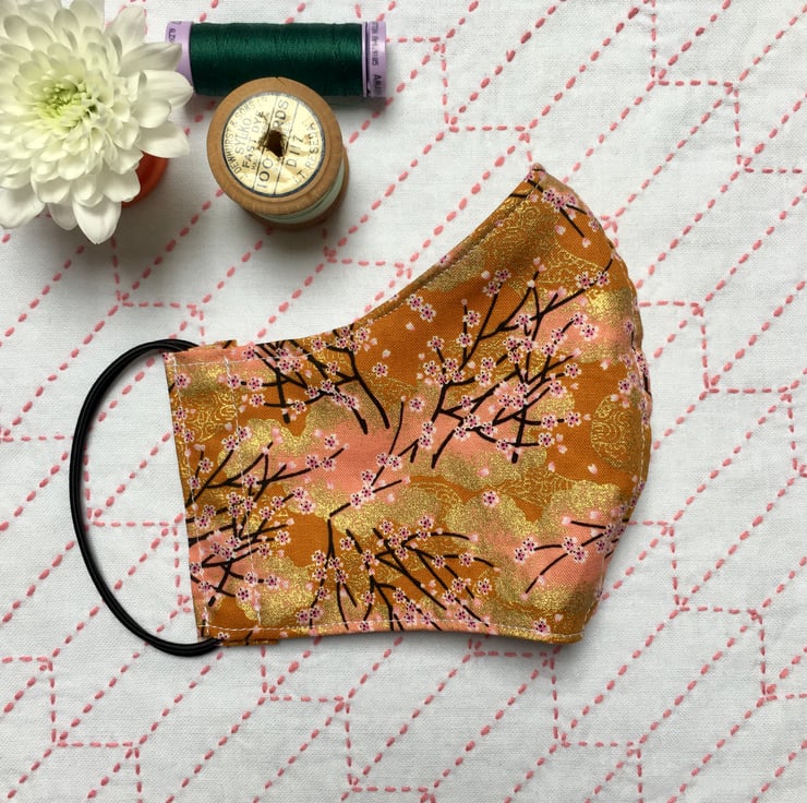 A very pretty peach coloured blossoms Japanese fabric has been used to create this face mask. The fabric is 100% gilded high quality cotton. It has been lined with at least a 400 thread count cotton, which is extremely soft against the skin. The mask is washable & reusable.