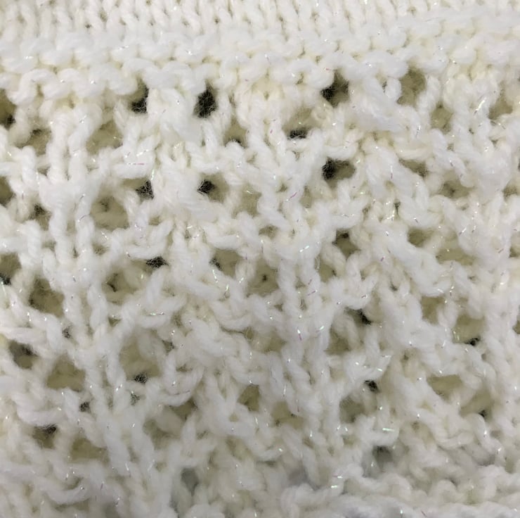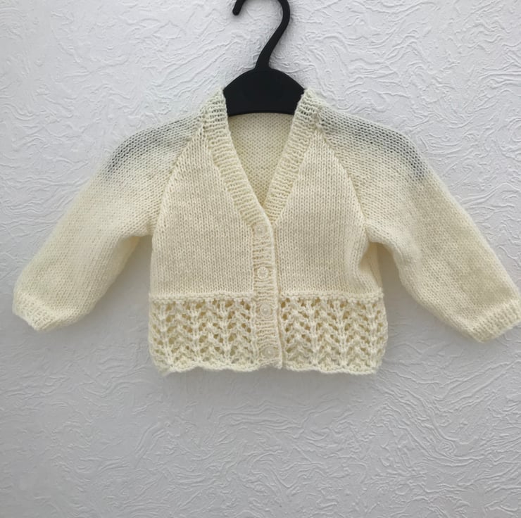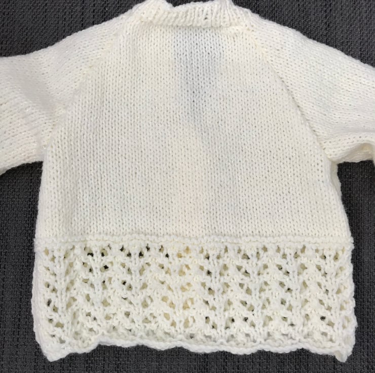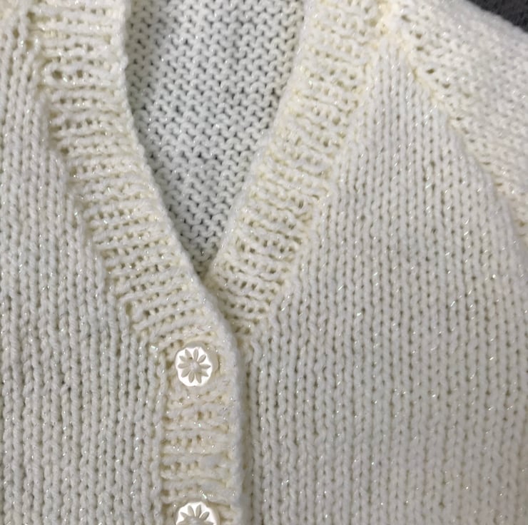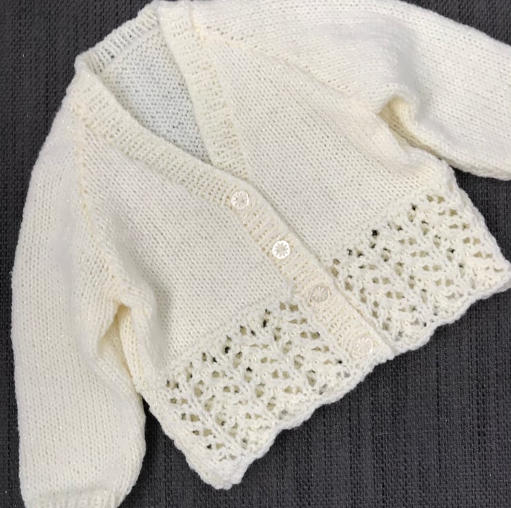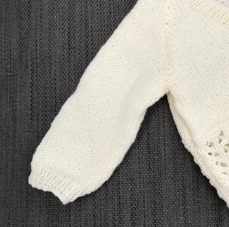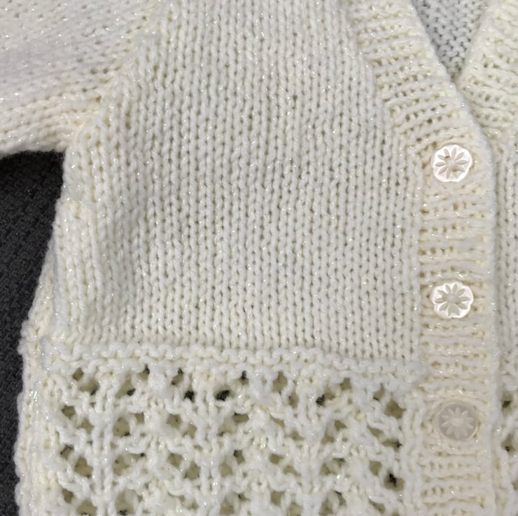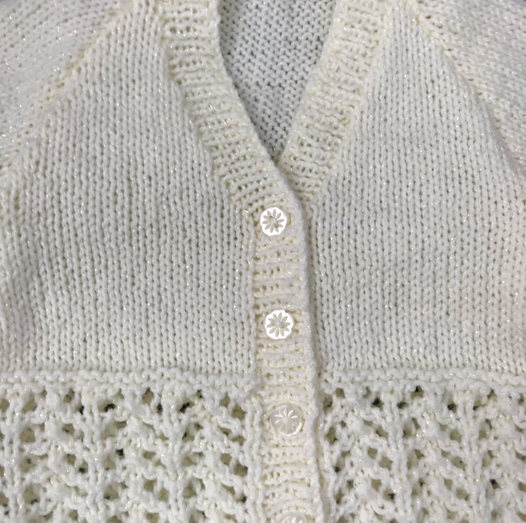 A hand knitted cardigan worked in a synthetic yarn with a sparkly thread. The bottom of the cardigan is knitted in an openwork pattern. It has a v-neck and fastens with four flower shaped buttons. The colour is a deep cream which doesn't really show up in the photographs.