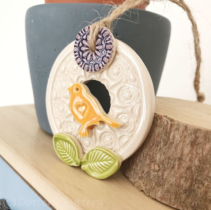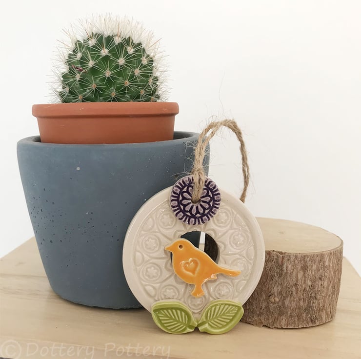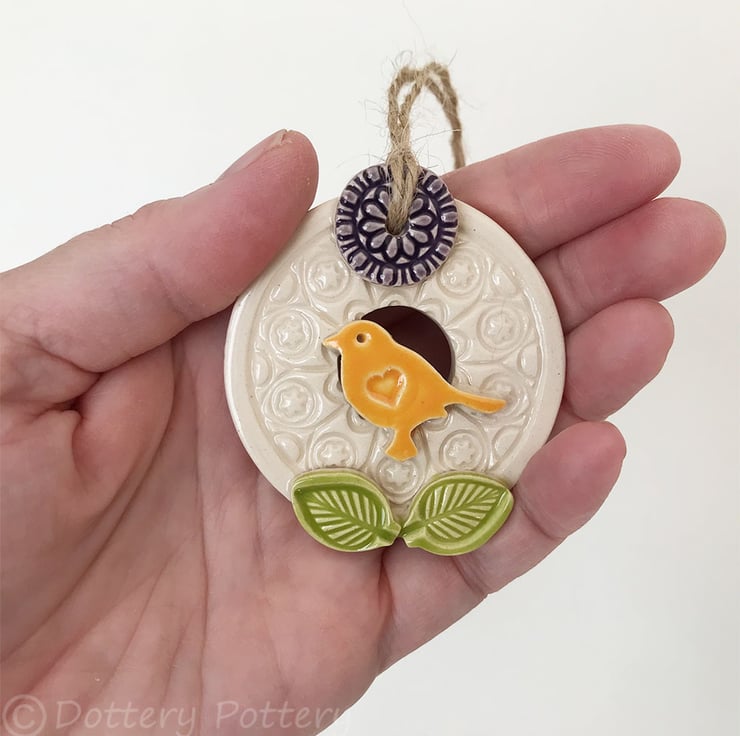 This little bird house decoration is made from white earthenware clay and finshed with a little flower and a bright bird. It has been fired twice and finished with a glossy glaze for a lovely smooth finish. It measures 5.5cm diameter and hangs from rustic brown string