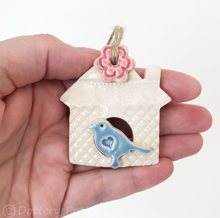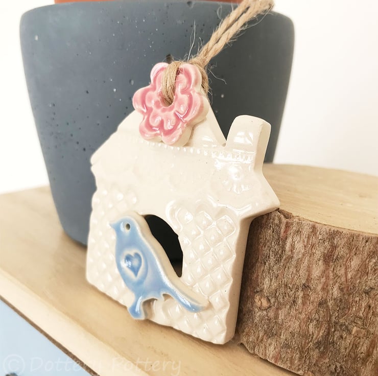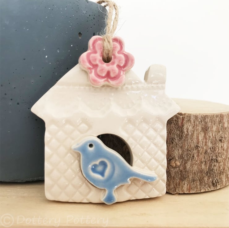 This little bird house decoration is made from white earthenware clay and finshed with a little flower and a bright bird. It has been fired twice and finished with a glossy glaze for a lovely smooth finish. It measures 7.5 x 7cm and hangs from rustic brown string