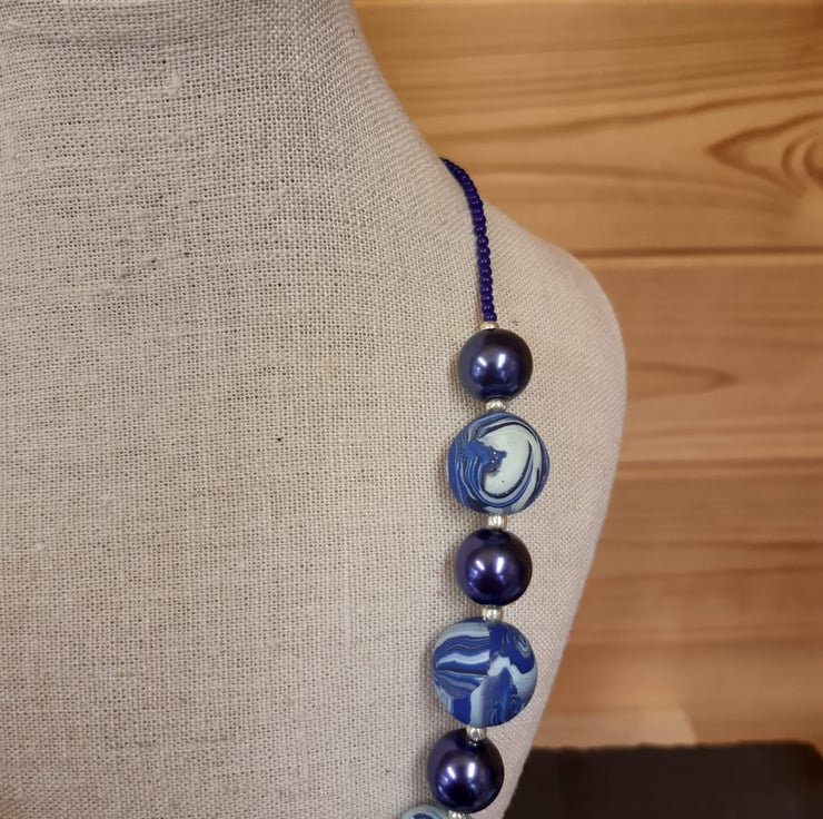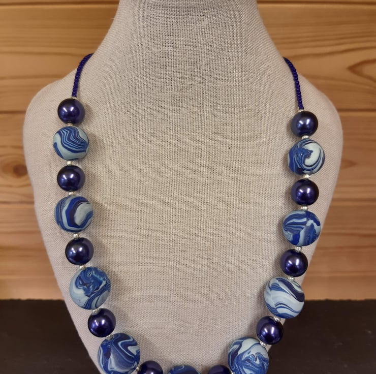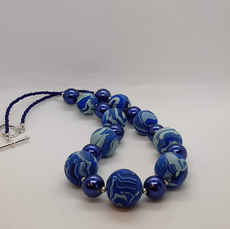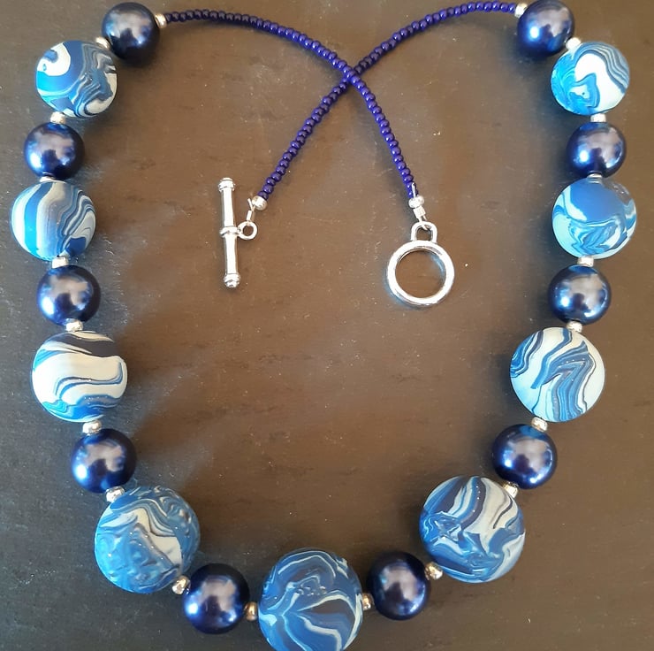 A handmade polymer clay necklace comprising 9 royal blue, navy and creamy light blue beads with a hint of sparkle, interspersed with bright royal blue 12mm round beads and silver spacers.