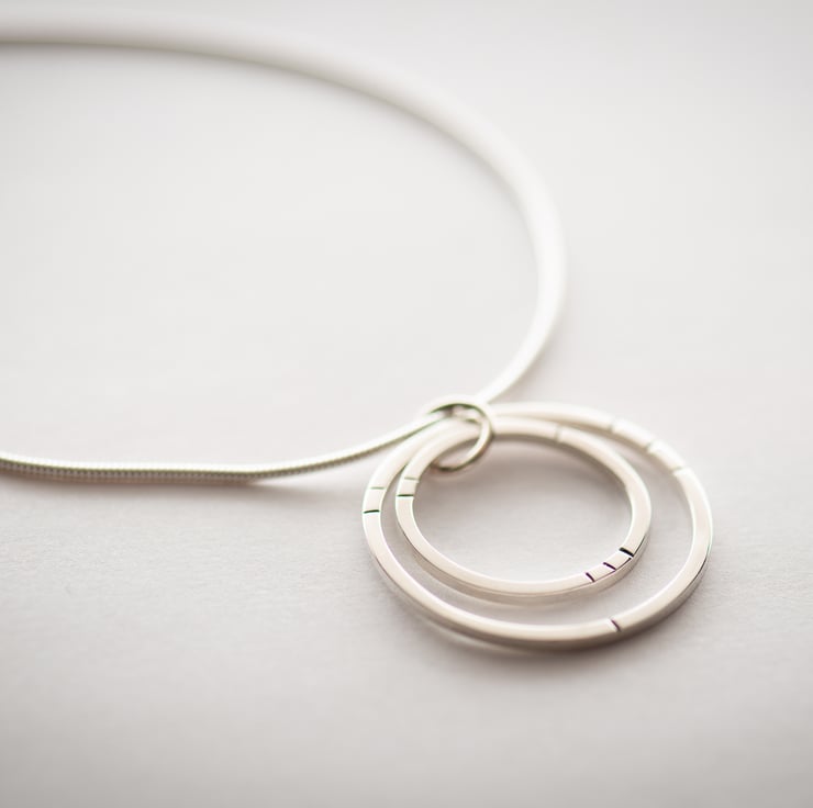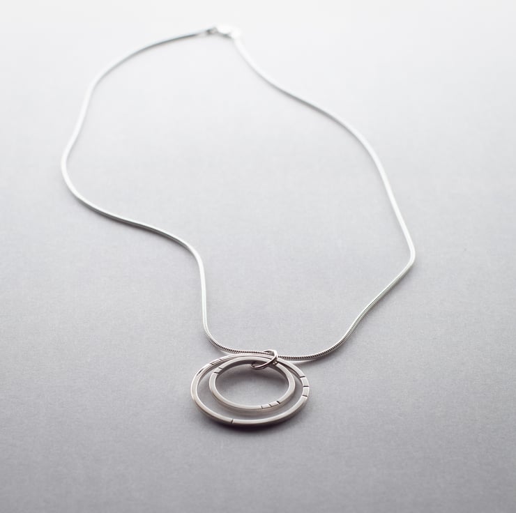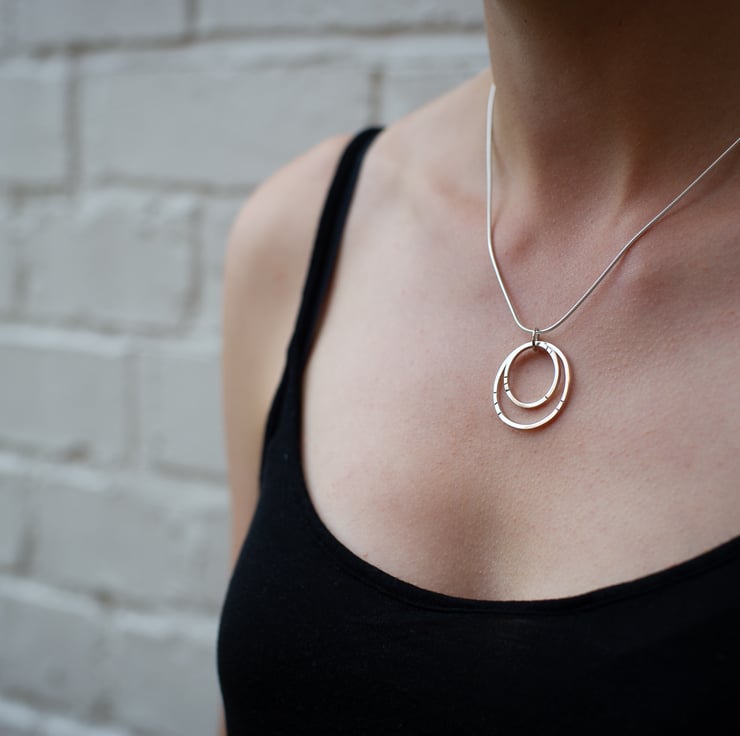 This necklace is handmade from sterling silver. I have used square profile wire which I have shaped and then soldered. I have also hammered line details onto the front of the two circles.