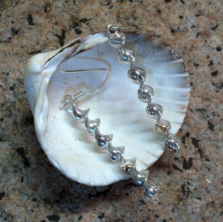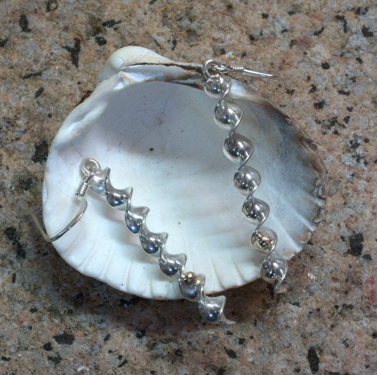 Long drop silver earrings with twisted helix design and 9ct ball.