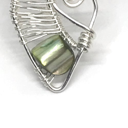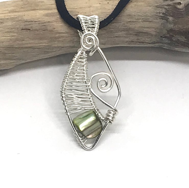 A unique handcrafted silver pendant with wire weave design and a beautiful green shell bead. Handmade with silver filled wire.