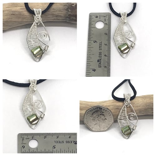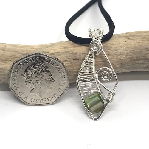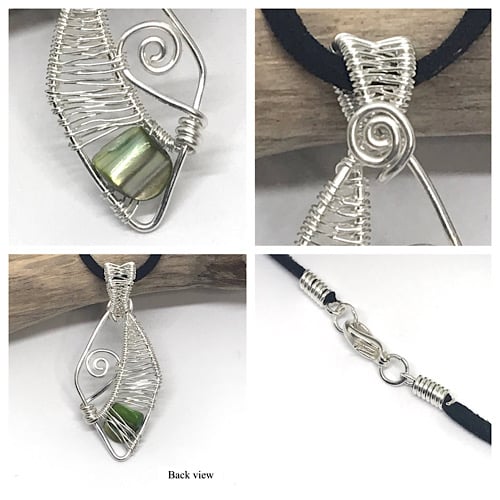 I have formed silver filled wire into a diamond shape, created a wire weave bail and continued the wire weaving design on the left side incorporating a green shell bead with a beautiful lustre. I have created elegant swirls of silver on the right side of the diamond shape and also at the top. This pendant is completed with a faux suede necklace with handmade silver filled components and a silver plated clasp.