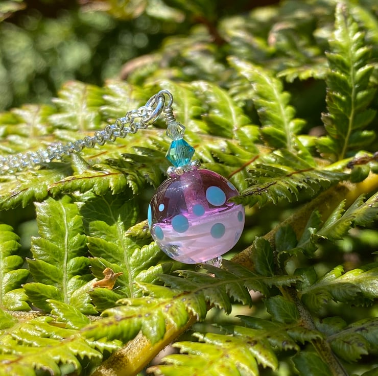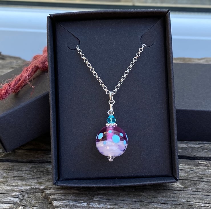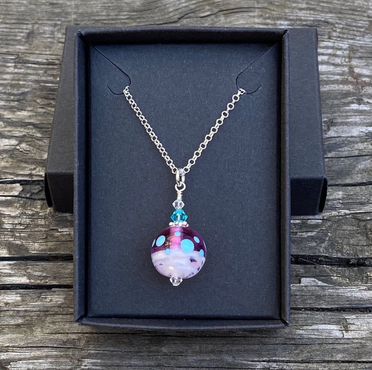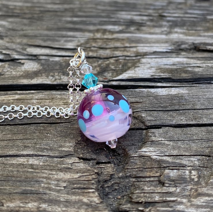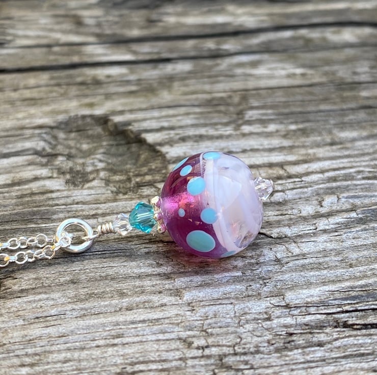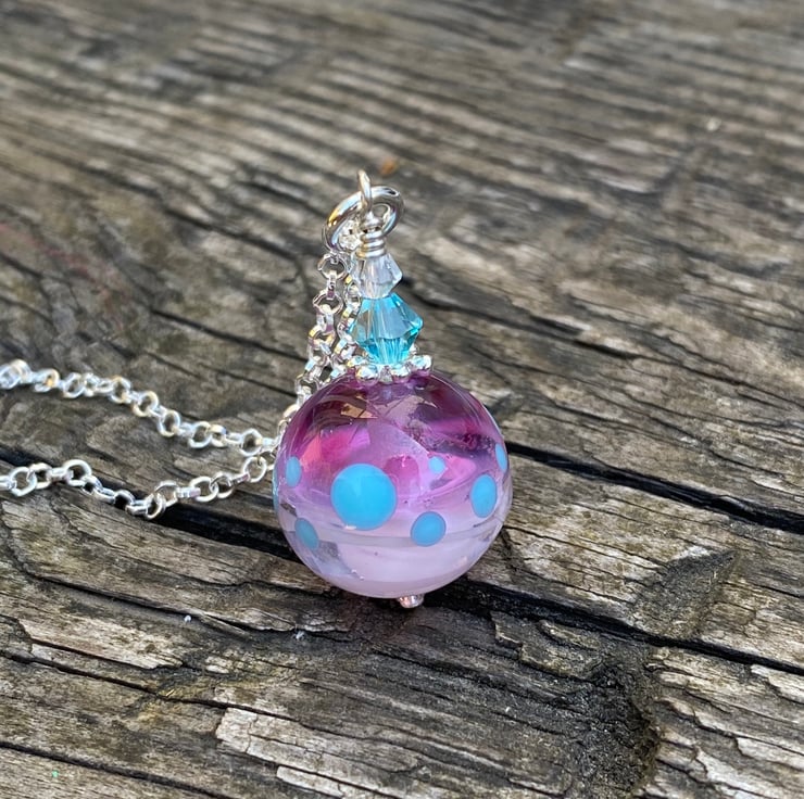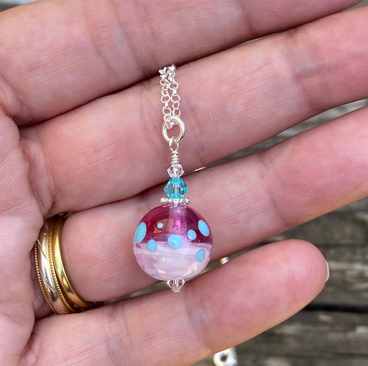 Pink round Lampwork Glass Pendant Necklace. Sterling Silver.