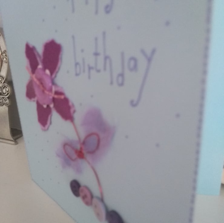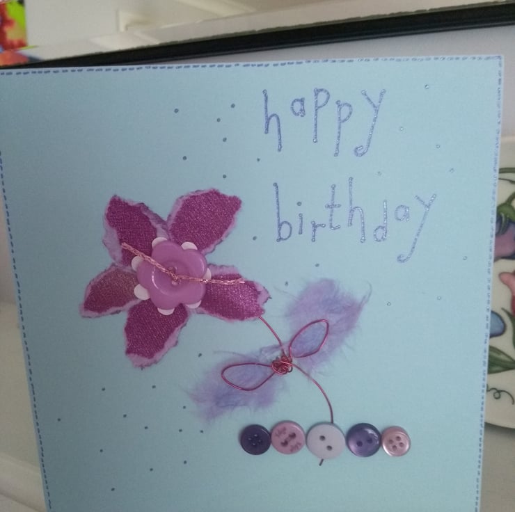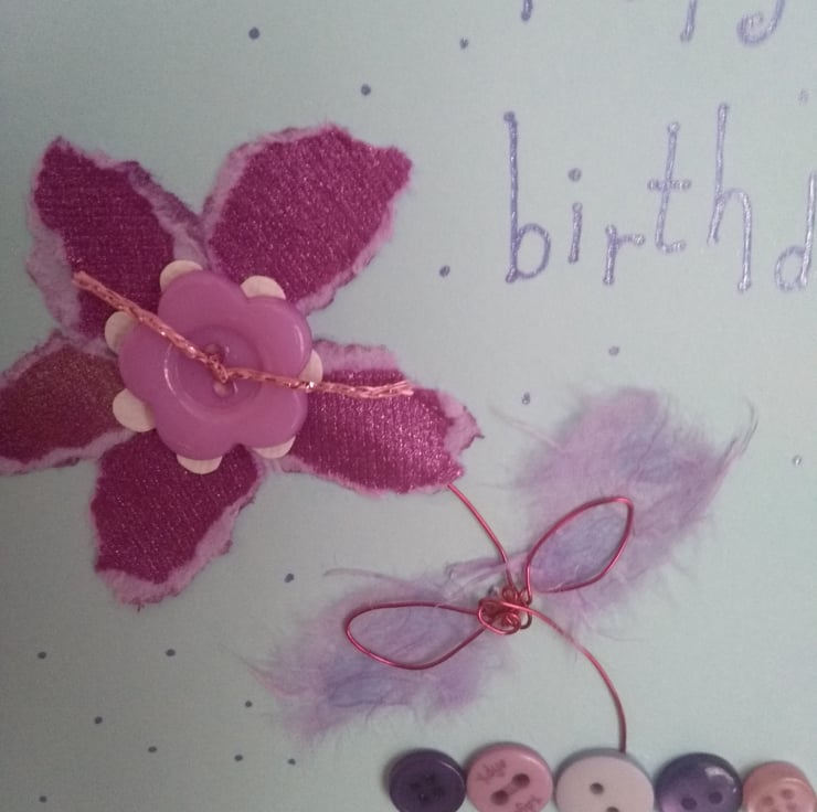 A completely handmade and uniquely designed card. Consisting of a flower handmafe from mulberry paper. Had a pink wire stem and leaves. Lilac mulberry paper leaves. Happy birthday handwritten in purple ink. A daisy button flower embellished the flower and a row of co ordinating buttons finishes off this pretty design. All mounted onto quality blue card