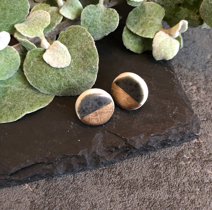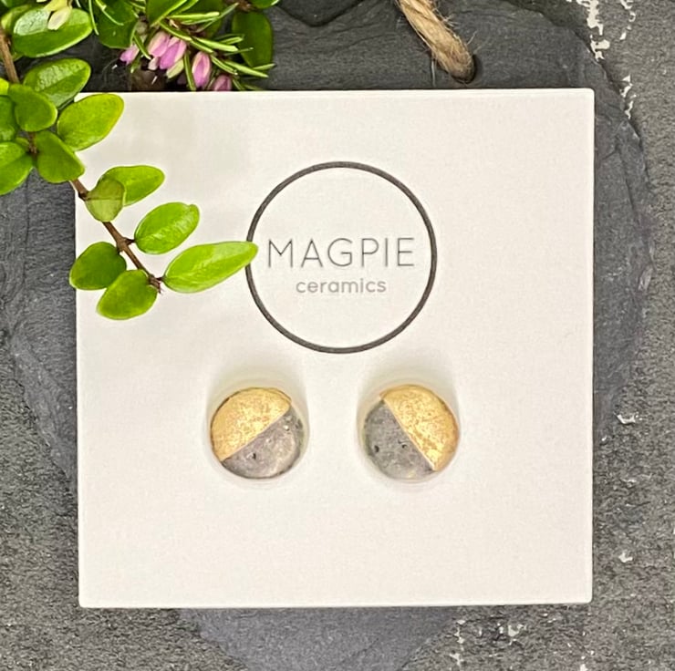 A pair of ceramic earrings, made with a white earthenware clay and glazed in a semi matt mottled grey, then finished with gold leaf to half.