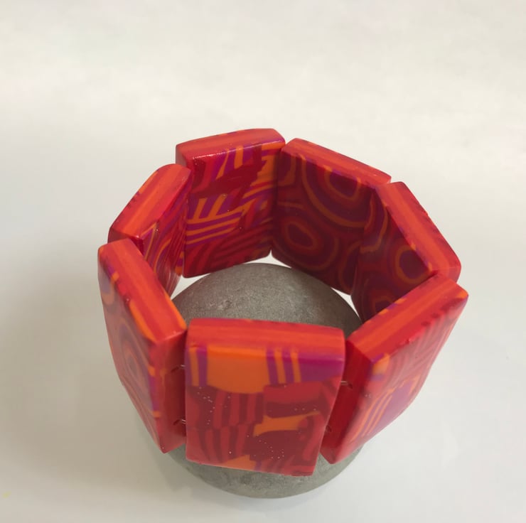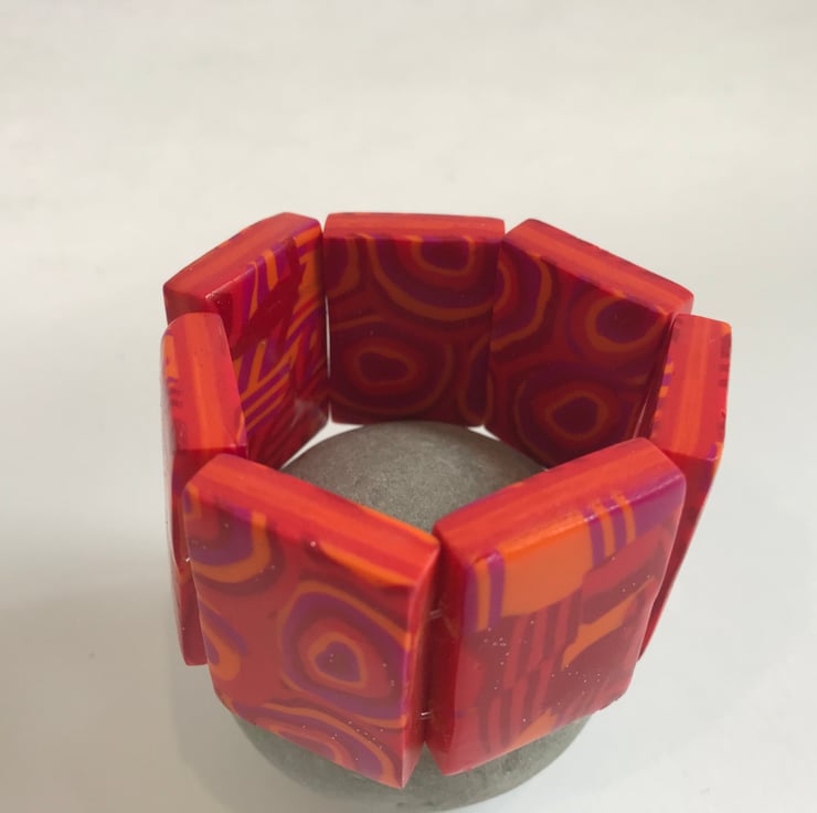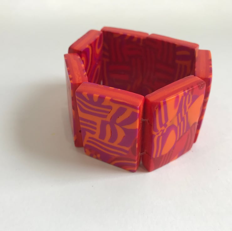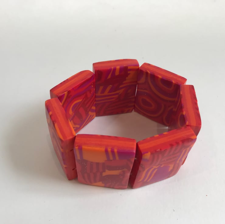 A bold mix of glitter-red, orange and hot pink polymer clay creates a colourful and dramatic piece of handcrafted jewellery. The bracelet is constructed from seven double-sided rectangular tiles, which are threaded on strong beading elastic, to create a bracelet that is easy to slip on and off the wrist.