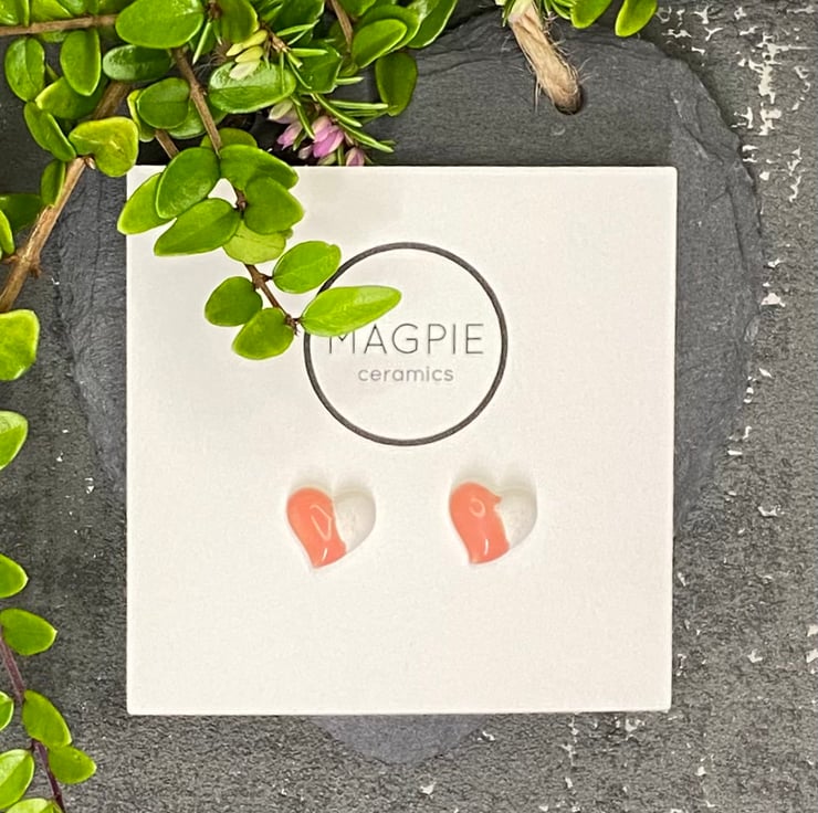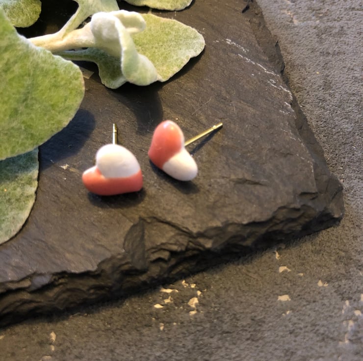 A pair of dainty heart shaped ceramic earrings, made with a white earthenware clay and half glazed in a glossy baby pink.