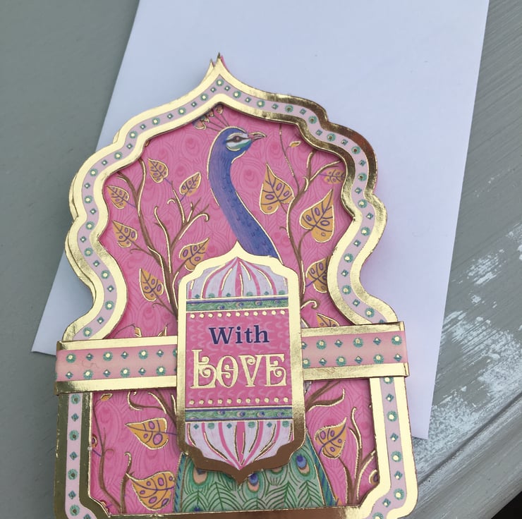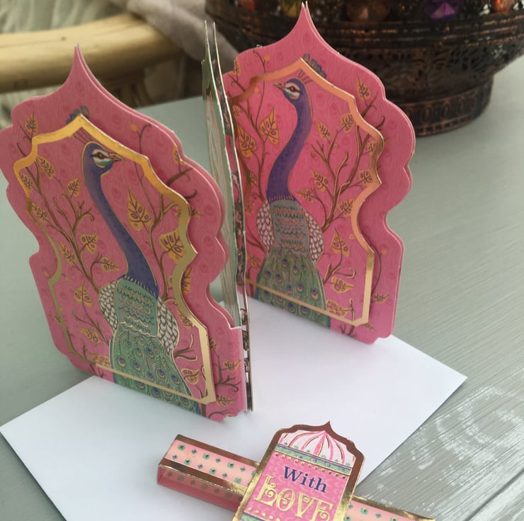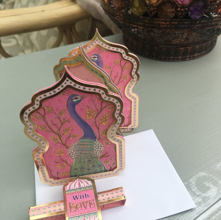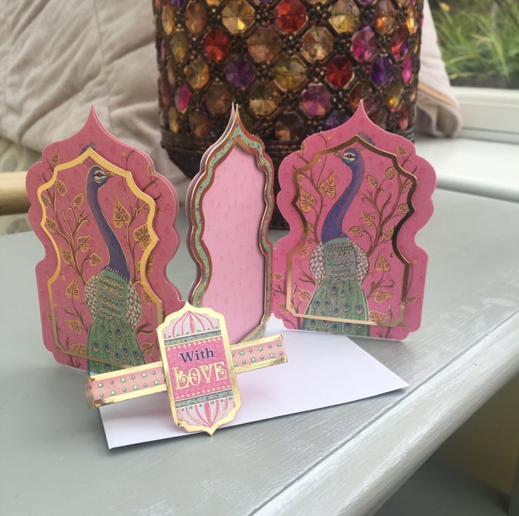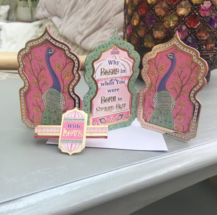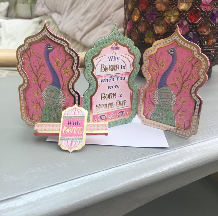 Do you know a show off, someone who always stands out in a crowd? A proud and flambouyant person who rightly needs celebrating? Then this card is just right for them. A trifold layerd peacock embellished miniature masterpiece. Shocking pink, purple and green make this a noticable little creation. This mineret shaped 3 panelled card is adorned with proud peacocks, the middle panel has the greeting Why blend in when you were born to stand out. There is a plain pink panel for you message. The bijou creation is held together with a matching belly band with a With Love greeting.