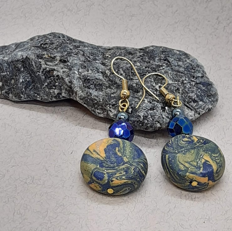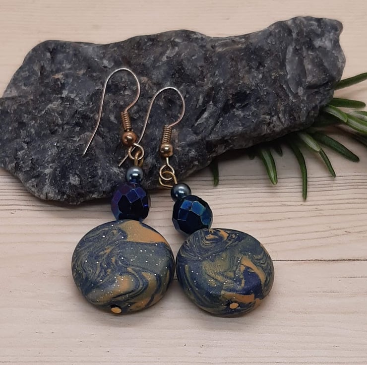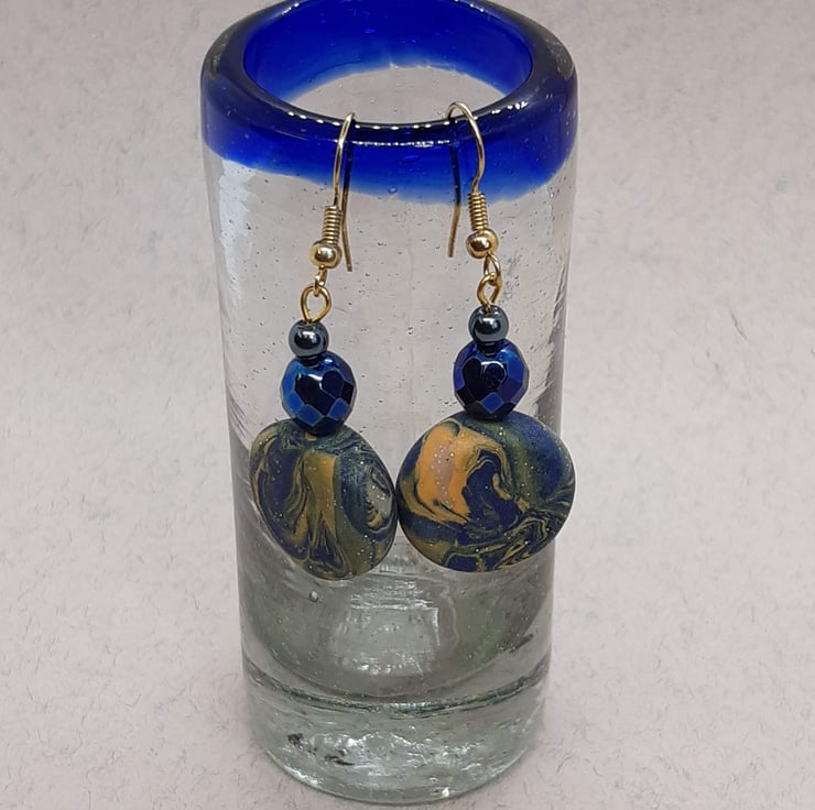 Handmade polymer clay disc shaped dangly earrings in a navy and mustard and sage green sparkly swirl design with a drop of approx 32mm.