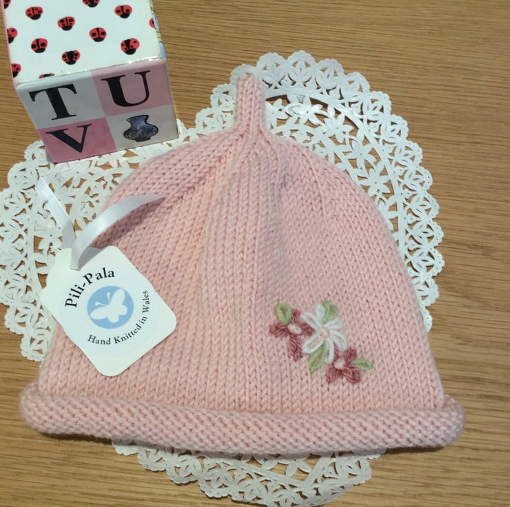 This soft little hat was hand knitted by me. It is knitted in a cashmere blend wool that is soft for babies but can also be machine washed at 30 degrees.