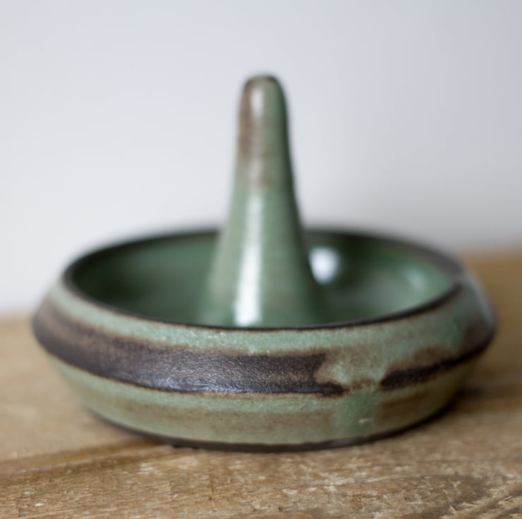 Ceramic ring holder made from black clay with a green glaze. Ideal for putting your rings and other small jewellery at the end of the day ready for wearing the next day or to be transferred to your jewellery box.