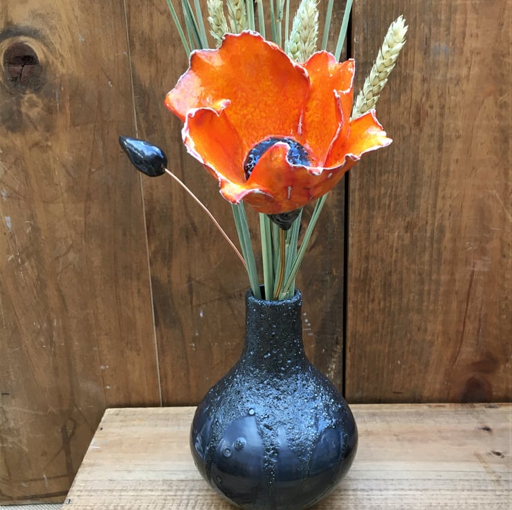 Beautiful ceramic handcrafted Poppy flower arrangement in a pewter coloured ceramic vase with ceramic sculpted poppy head for a thoughtful and unique forever gift.