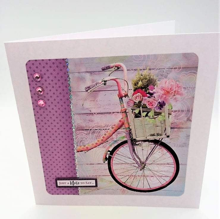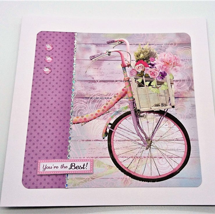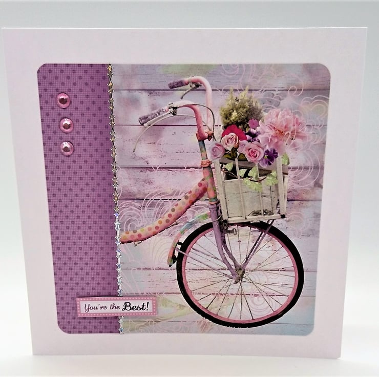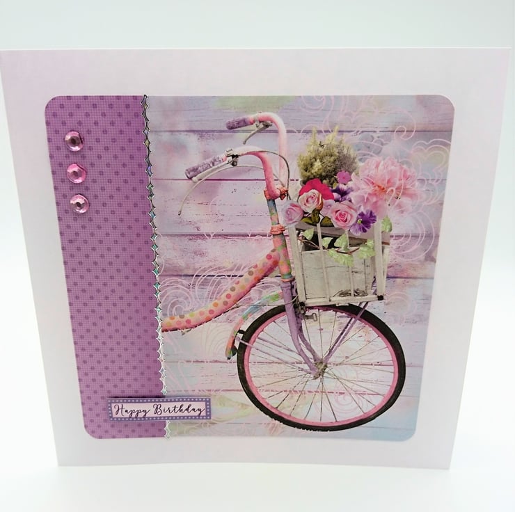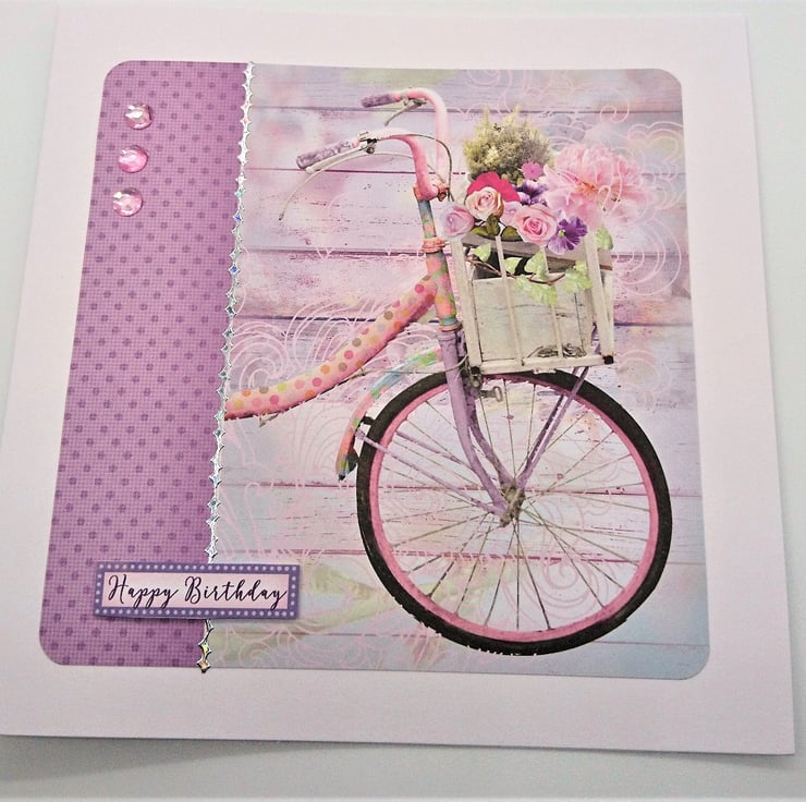 DESIGN: Top quality white card, layered with Hunkydory design - A pretty pink spotty polka dot bicycle with basket of beautiful flowers, on purple, lilac and pink background. Embellished with three pink pearl gems, silver and raised sentiment. Handmade with love in my wee studio in Scotland.