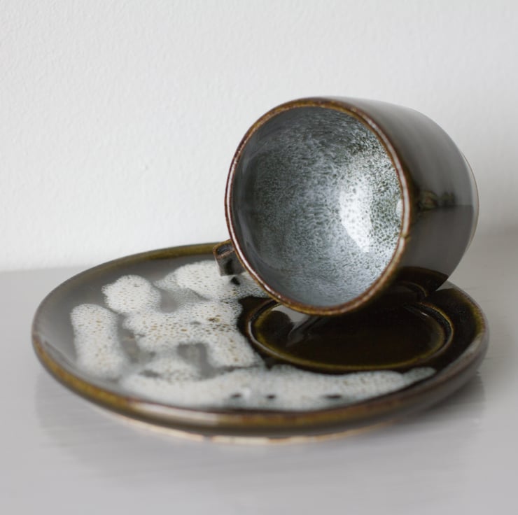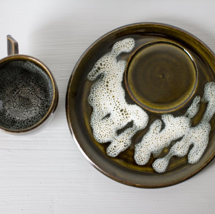 The saucer is dark green with white glaze dribbled over it which has fired to give a foam like appearance.