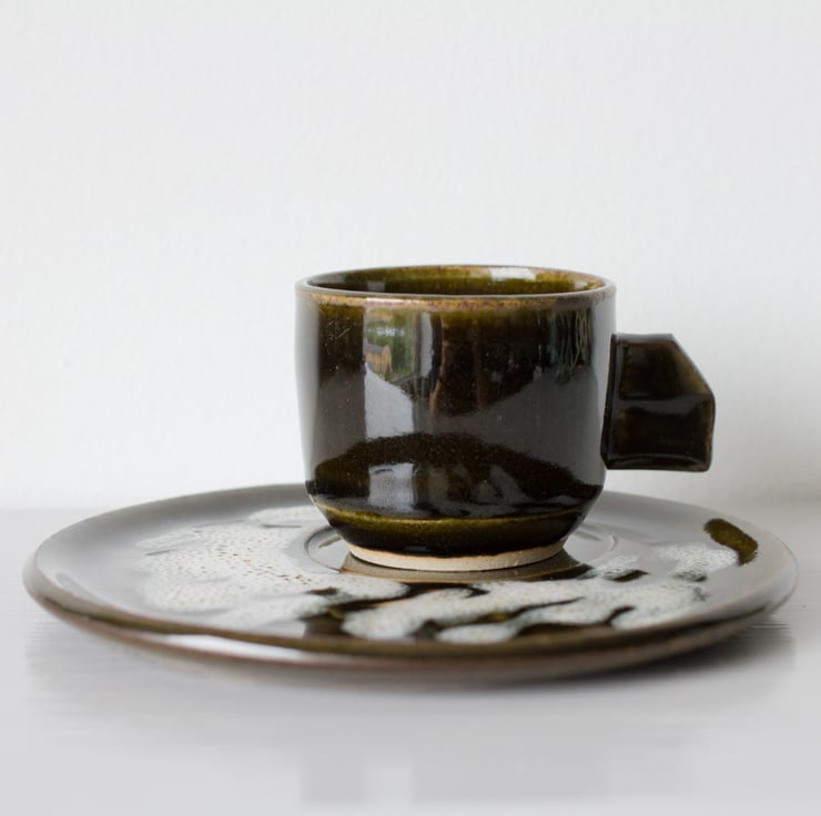 Small dark green and white espresso cup with angled handle and accompanying off-centre saucer.