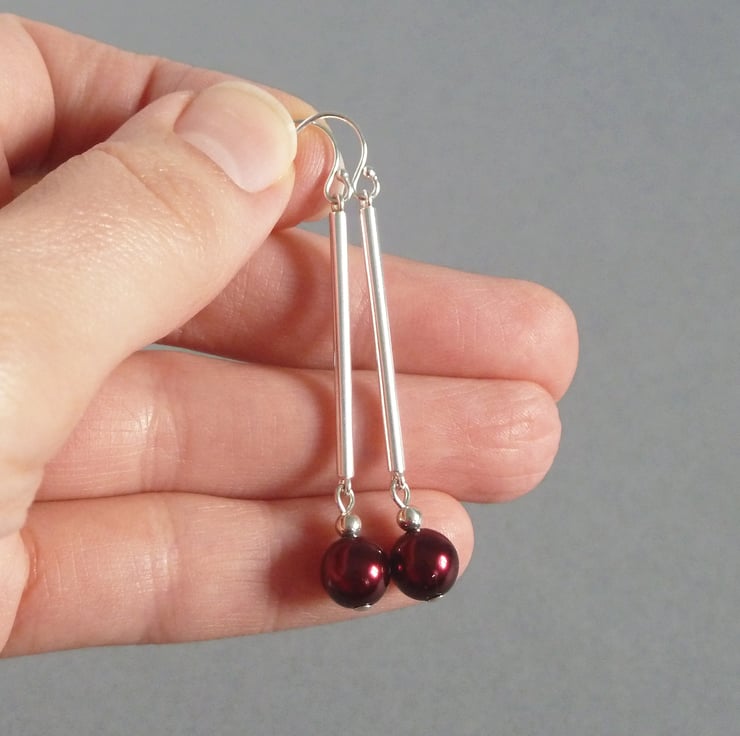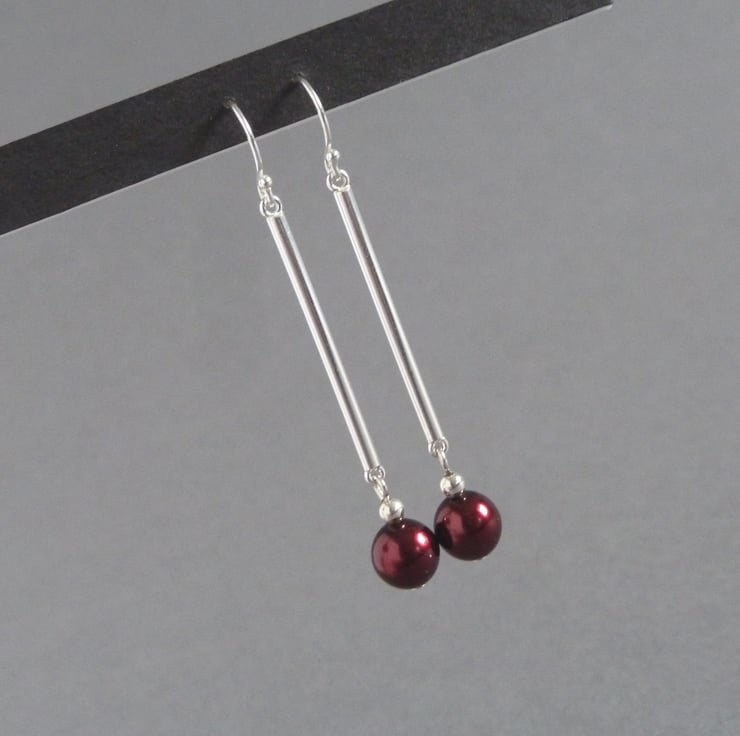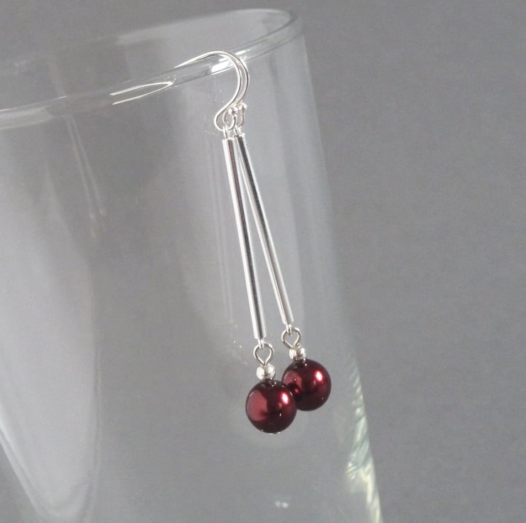 To create these long, drop earrings, I have hung 8mm burgundy Czech glass pearls from silver bars. Simple in design, these claret dangle earrings are great for wearing everyday, to finish off an outfit.