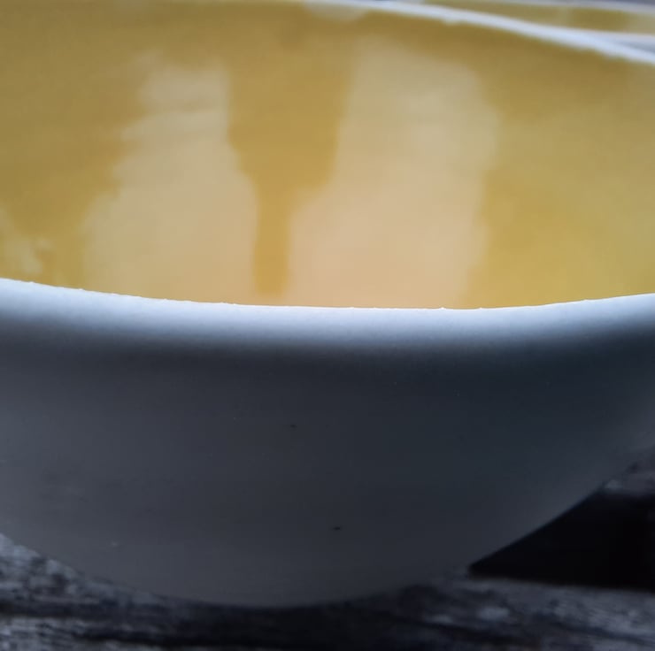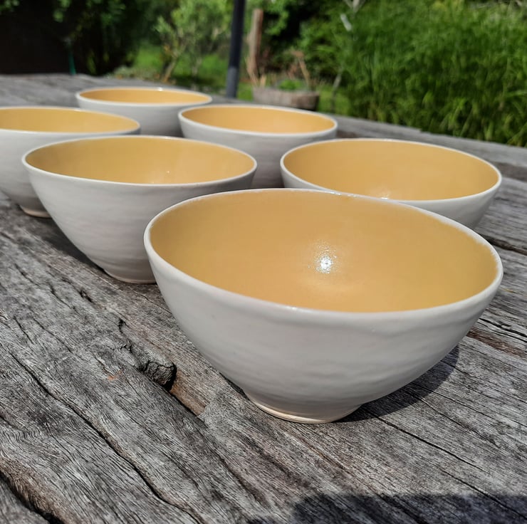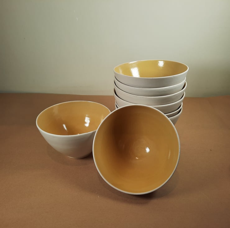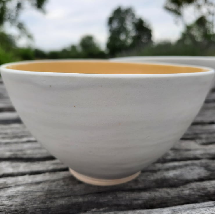 Hand made ceramic bowls suitable for cereal, soup, salad etc. It has been glazed inside with a yellow glossy glaze, on the outside a satin white. The bowls have been made from a hard wearing stoneware clay, making it suitable for everyday use.