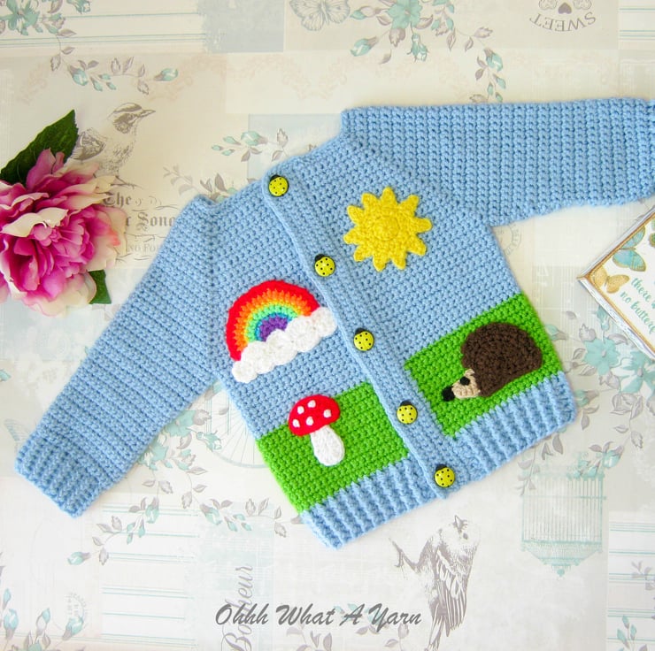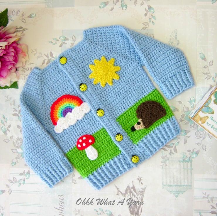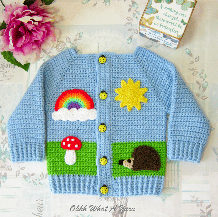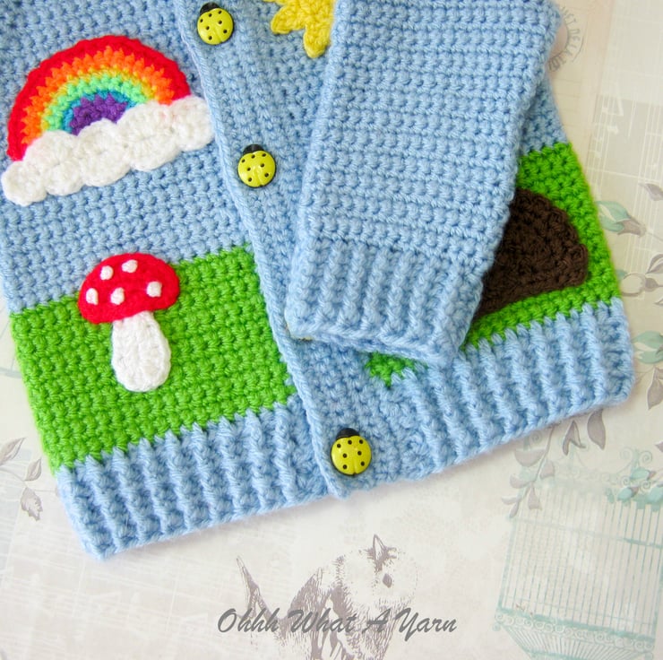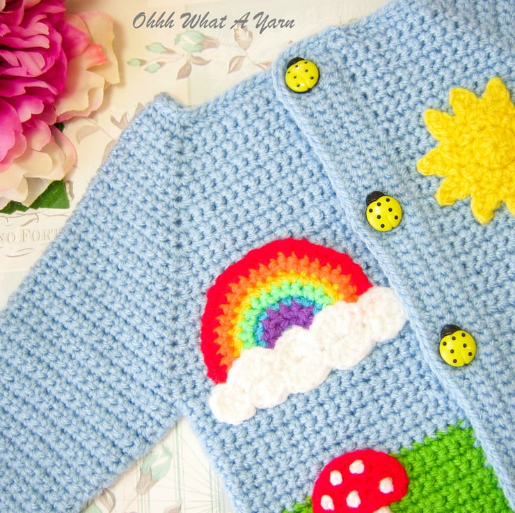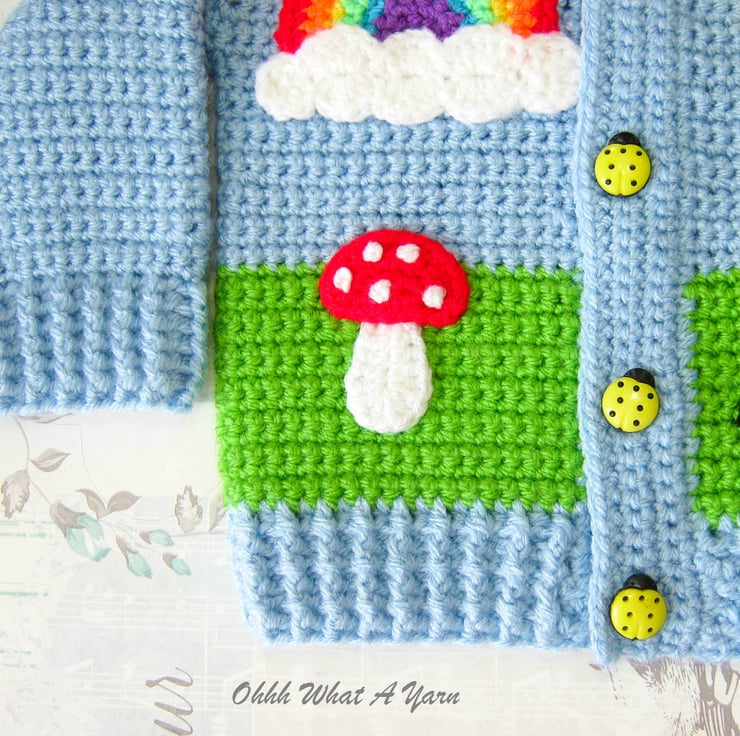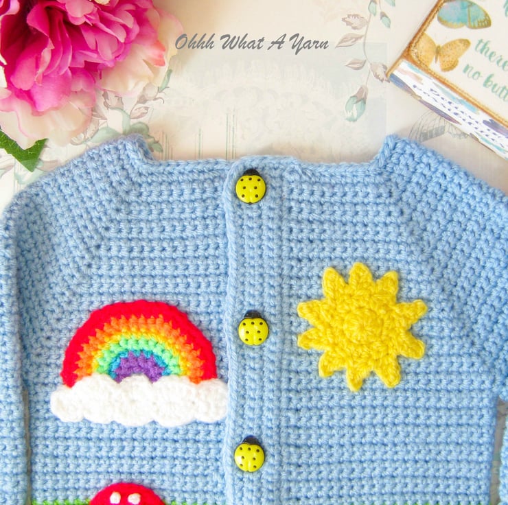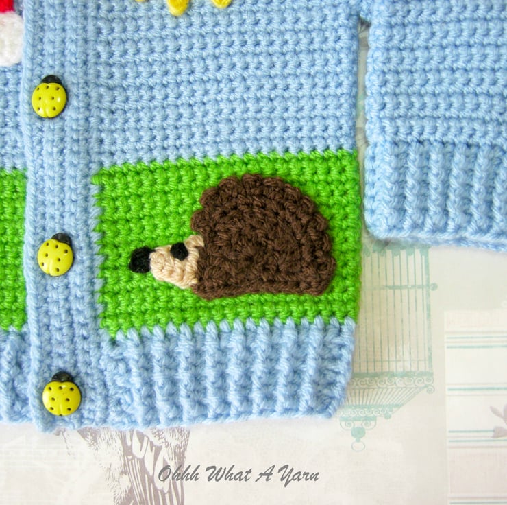 I have added hedgehog, rainbow, sun and toadstool appliques to the front and as a finishing touch it fastens with five gorgeous yellow ladybird buttons.