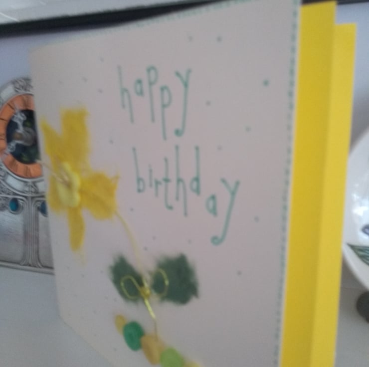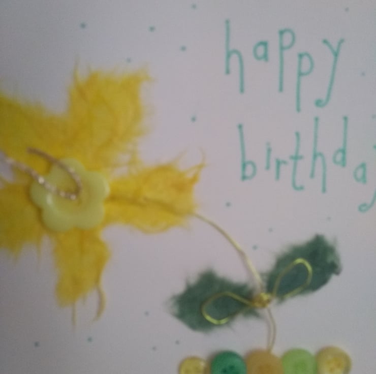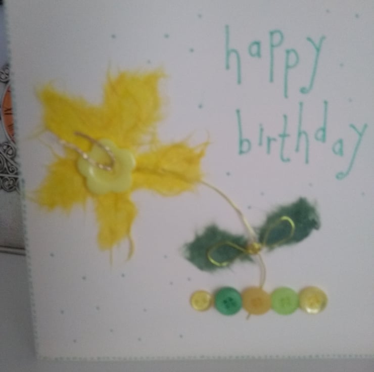 A completely handmade and uniquely designed card. Consisting of a funky flower completely handmade from mulberry paper for the petals and leaves. Yellow wire is used for the stem and leaves. A pretty yellow daisy button finishes off the centre of the flower. Happy birthday handwritten in green ink. Finished off with a row of co ordinating buttons. All mounted on to quality cream card.