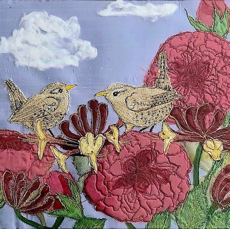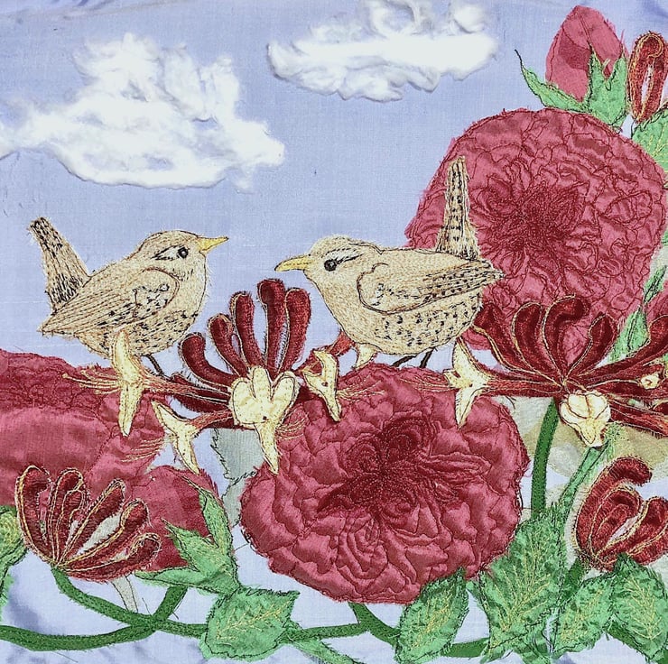 Rose, Honeysuckle and Wrens textile artwork created by textile artist Heidi Meier.