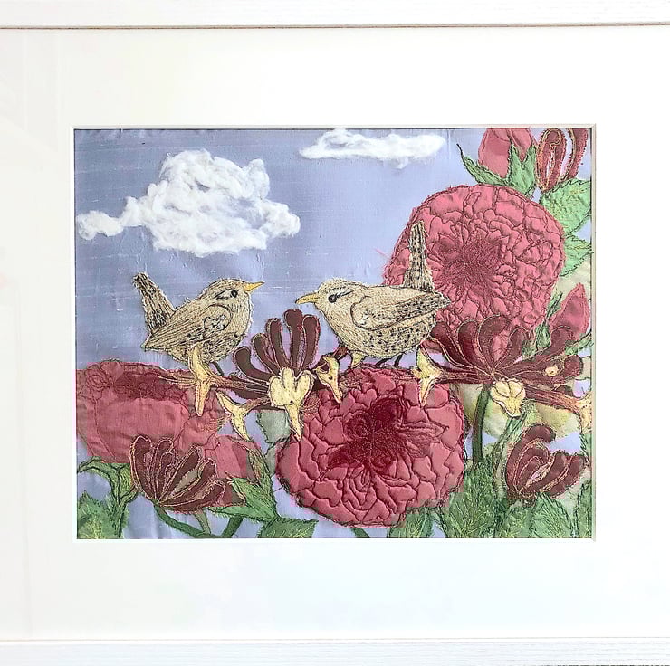 This substantial textile artwork is created using primarily silks and some sheers to give it added sheen. Two wrens sit atop a sprig of honeysuckle which has entwined around luscious old English roses, on a perfect summer's day!