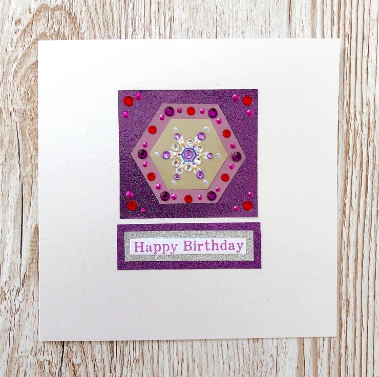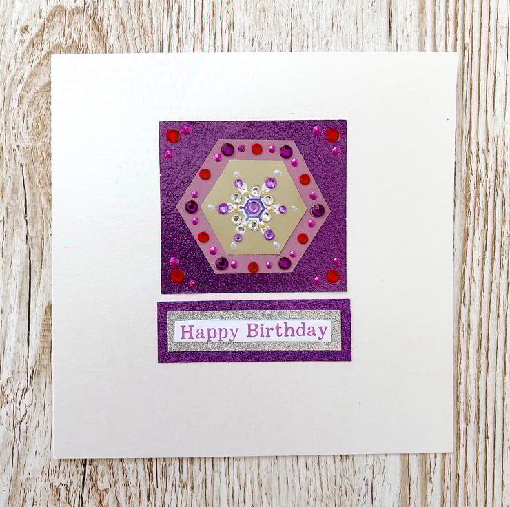 Birthday card - handmade with sparkly faux jewels (rubies, dark amethyst, diamonds and pale amethyst).