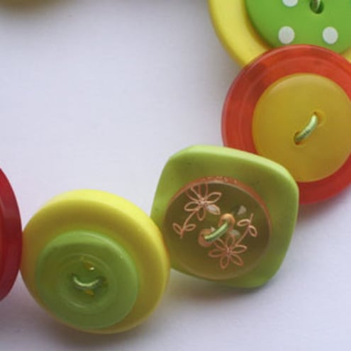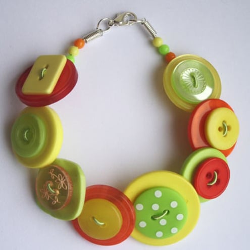 This distinctive button bracelet is rich with an assortment of yellow, orange and green buttons. These are threaded onto jewellery wire, which secures at the end with a silver plated lobster clasp fastener.