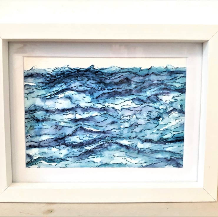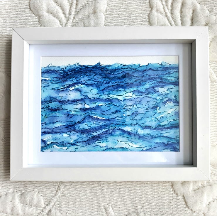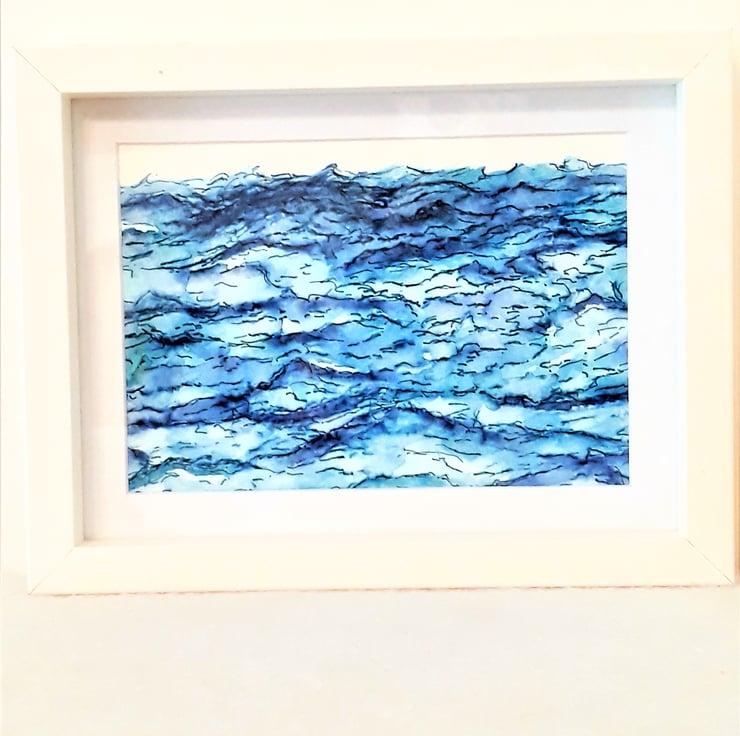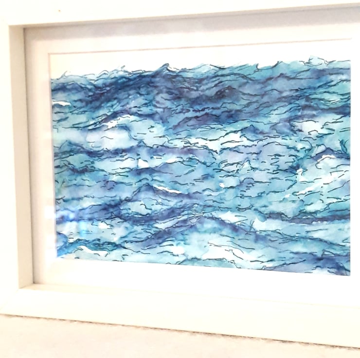 This is an original painting in watercolour of an abstract sea scene. Beautiful, vibrant blue, it is ready framed, ready to hang or stand; it can be used either way. The frame is minimalist white, a lovely compliment to the painting and suitable for most rooms. Tranquil and serene, this wave painting is fresh and calming.