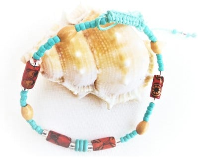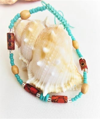 A beaded boho style ankle bracelet / anklet.I have used semi-precious gemstone dyed turquoise magnesite discs, pretty patterned wooden tube beads along with natural colour wooden rice beads and silver and turquoise glass seed beads. I have used strong turquoise coloured S-lon cord to thread them onto.