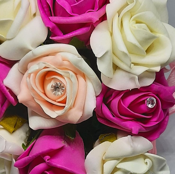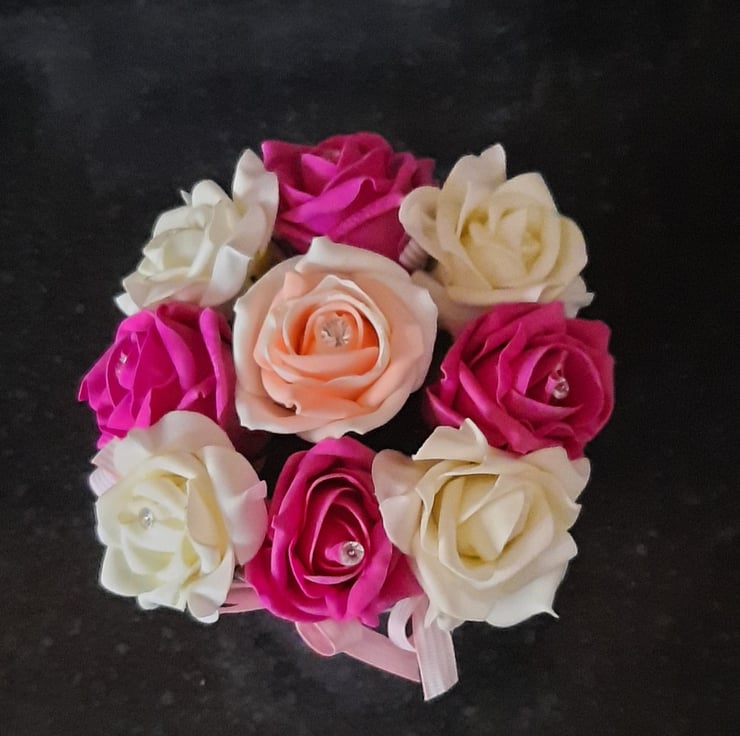 Each rose is approximately 5 cm and is complimented with a diamanté pin.