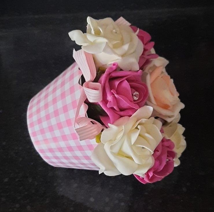 Flower cupcakes made with quality colourfast foam roses arranged and nestled inside a cupcake case with coordinating colour design.