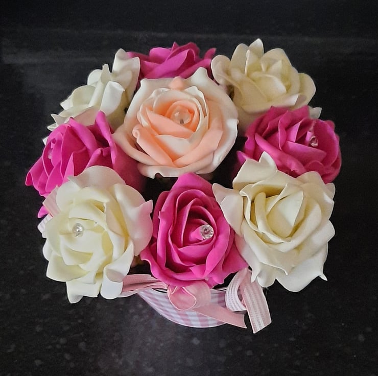 The roses are arranged and secured into florist foam.