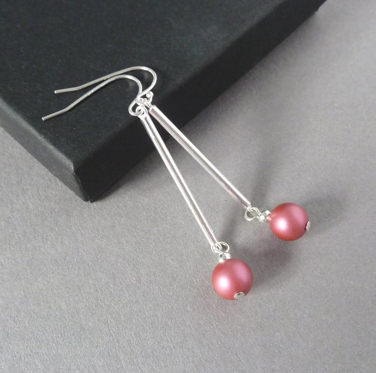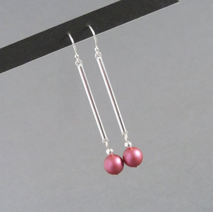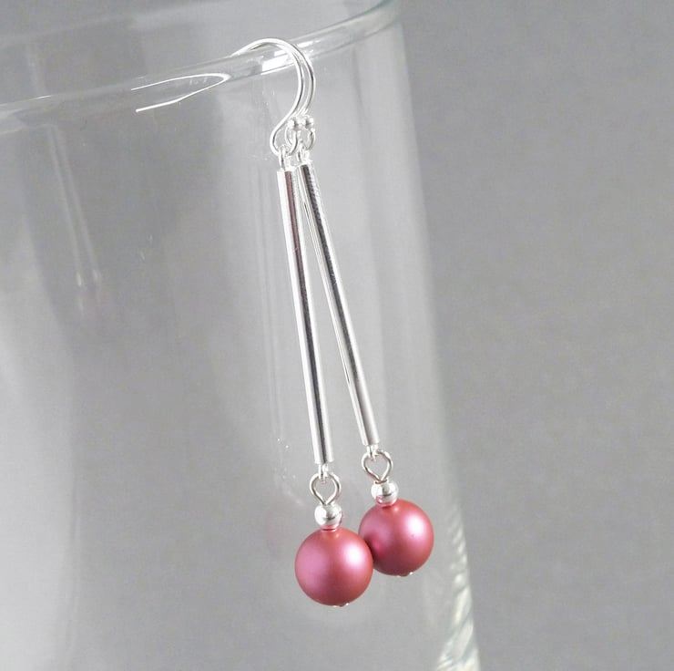 To create these simple drop earrings, I have suspended 8mm mulberry Swarovski pearls from long, Sterling silver bars. Classic in design, these minimal, raspberry pink earrings make perfect gifts and are great for finishing off an outfit.