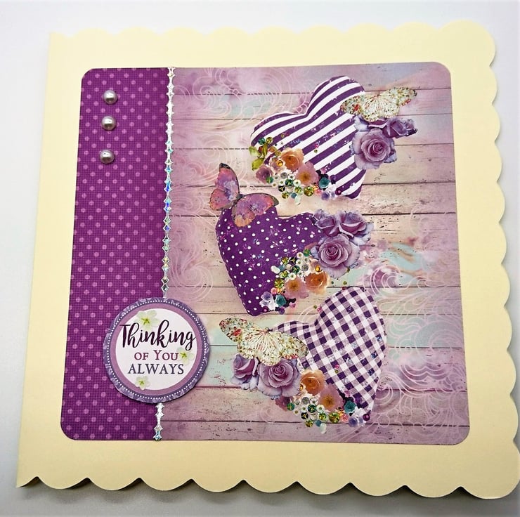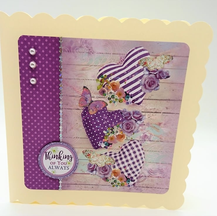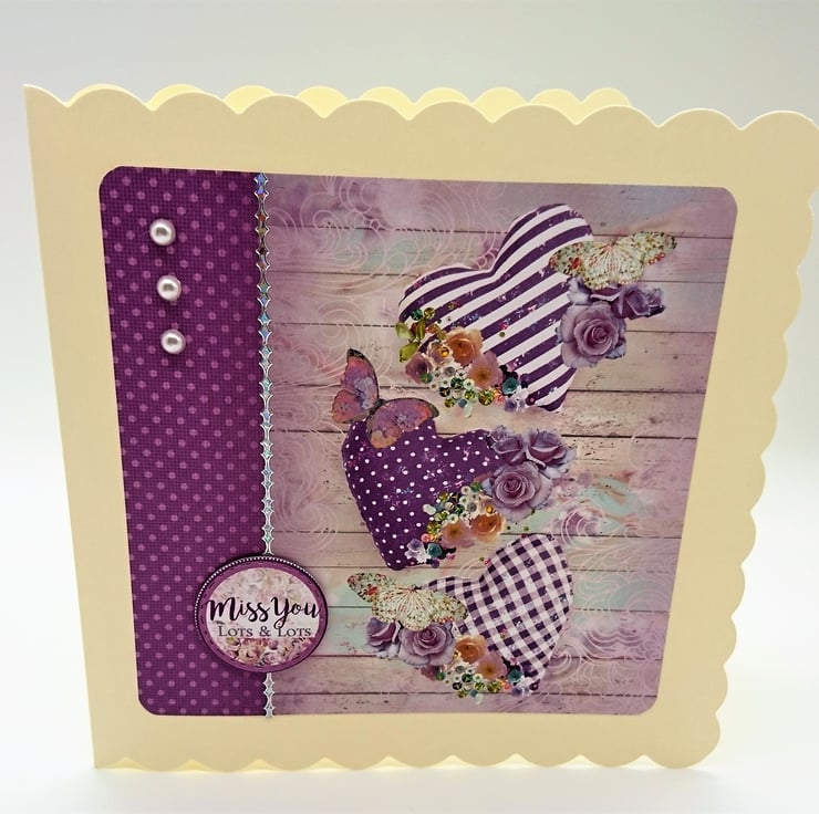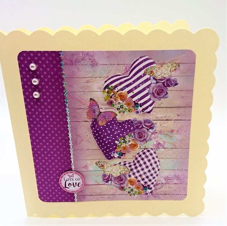DESIGN: Top quality cream scalloped edged card, layered with Hunkydory design - Beautiful purple polka dot, striped and checked hearts with gorgeous butterflies and flowers.. Embellished with three pearl gems, silver border and co-ordinating raised sentiment. All Heart To Soul cards are handmade with love in my wee studio in Dunoon, Argylll, Scotland.