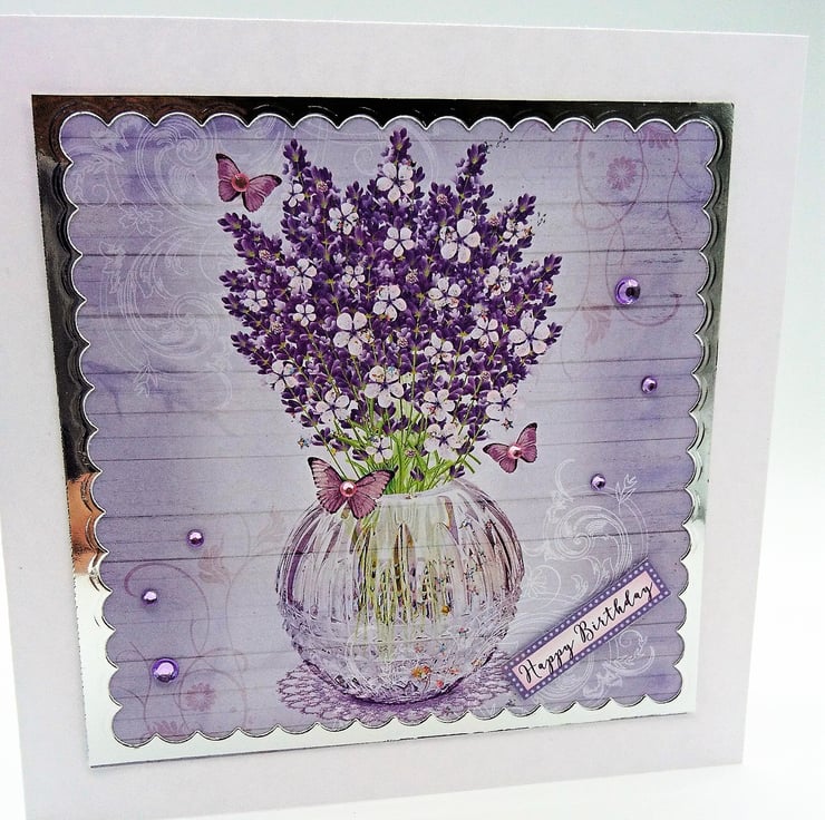 DESIGN: Top quality white card, layered with Hunkydory design - A beautiful crystal vase of purple and violet flowers with three pink butterfles. Embellished with matching pink and lilac gems, silver frame and raised sentiment. Handmade with love in my wee studio in Argyll, Scotland.