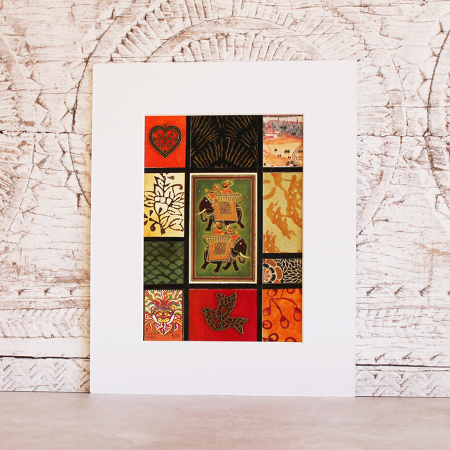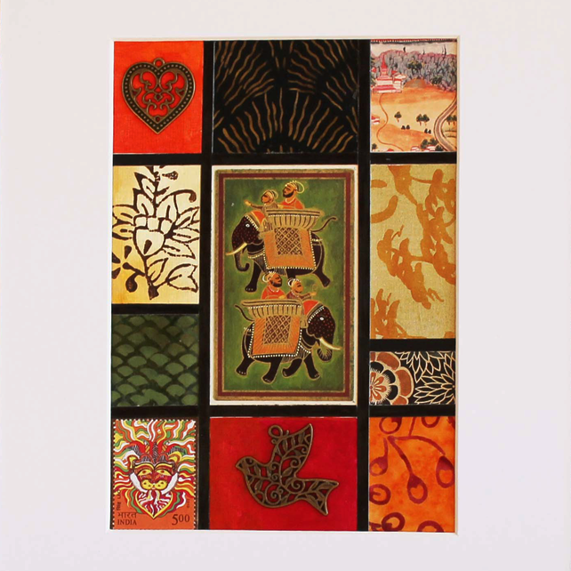 A mixed media artwork featuring a vintage playing card with a painting of Indian elephants. I've also used sections of batik, woodblock print, a postage stamp, decorations from old books and two antique gold tone filigree metal charms.