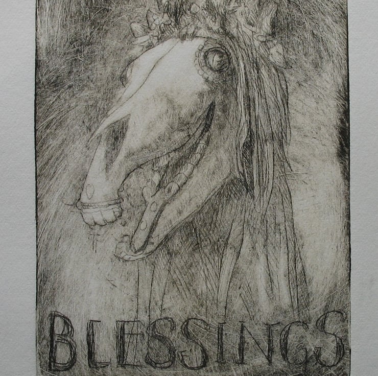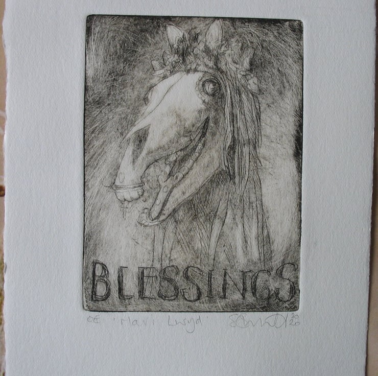 This open edition drypoint etching measures approximately 3"x4" and was printed from a plexiglass plate, etched with fine tools using warm black oil-based etching ink on Fabriano paper.