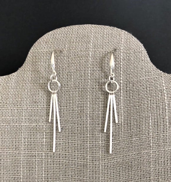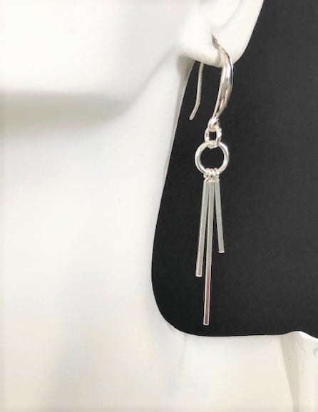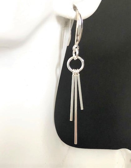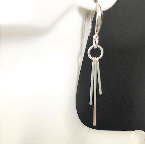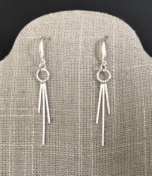 Sterling Silver Tassel Earrings made with three different lengths of Sterling Silver 1.2mm square wire attached to a Sterling Silver ring. The earrings hang from Sterling Silver hooks.